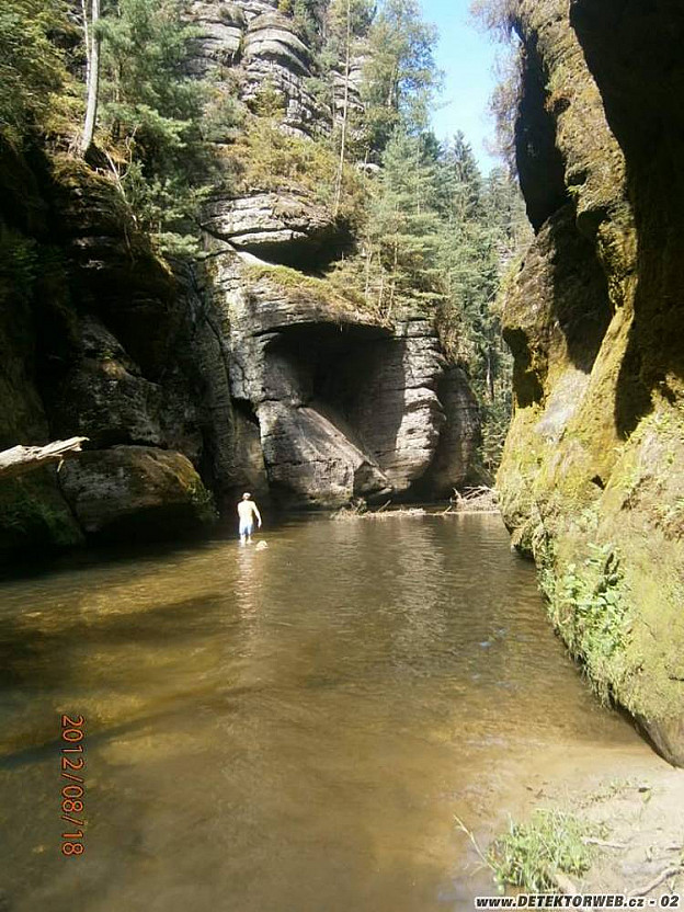 a na začátku než vejdeš do této soutěsky je naproti bývalému táboru velký převys tak tam byl dříve barák dědy kte který dostal při osídlování a za pár let ho musel opustit. když se později bourat tak byl plnej stříbrných tácu a příboru nějaké ládovačky a zlato a vedle baráku byl sklep a v něm zazděná knihovna v kuzi vázaná. dříve místo toho tábora byl malej hotýlek kde se zotavovali němečtí dustojníci z fronty no a tak při odsunu takhle vyfutrovali barák. no a stát si pomohl. jinak toho vím z okolí moc. a jestli kecám tak švihnu detektorem o zem a 5