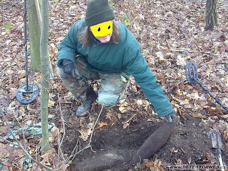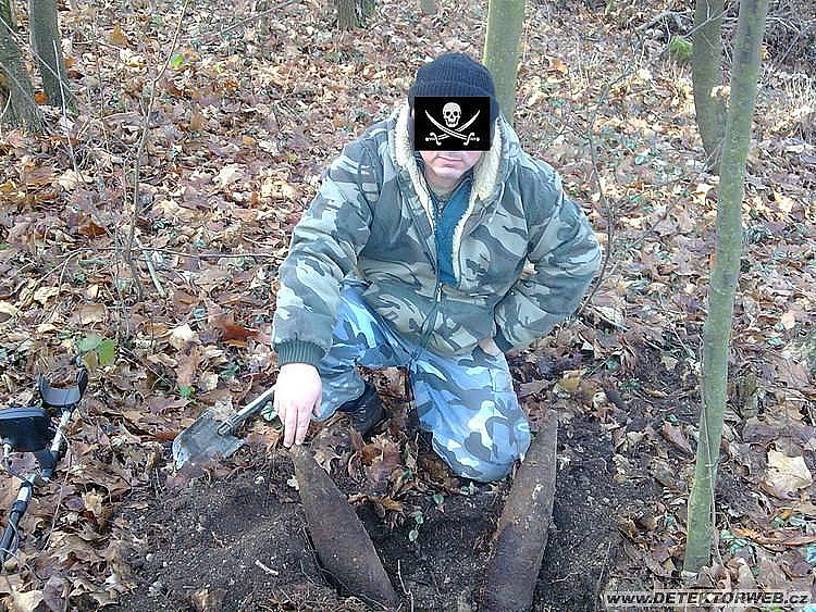 Volno mezi svátky a příjemné sluneční počasí s teplotami okolo nuly nás s Knechtem vytáhlo do lesa na jednu z posledních vycházek v roce 2009. No a 25 metrů od začátku lesa a zhruba 2 metry od lesní pěšiny, kde chodí maminky s dětmi, běžci huntují svá těla a pejskaři vodí své miláčky, mi pípnul signál "jak prase". Jakmile se objevil oblý tvar železné roury o průměru větším jak 100 mm, který se na konci kuželovitě zužoval, začalo mi pomalu docházet, co jsem to asi kopnul a proto další odhrabávání šlo v podstatně pomalejším tempu a spíše za pomoci prstů, než lopatky. No a to už jsem volal na Knechta, jestli nechce jednu patronu do svojí sbírky. Velice mě překvapil, že s hrůzou v obličeji odmítl... divné, že? Jeden telefon na linku 158 a měli jsme ještě dostatek času do příjezdu hlídky propátrat okolí a Knechtovi se podařilo odlehčit lesíku ještě o jedno - i když trochu menší - nepříjemné dědictví lidstva. Dle pyrotechnika jsou ty větší ráže 125mm a ta menší 75mm.