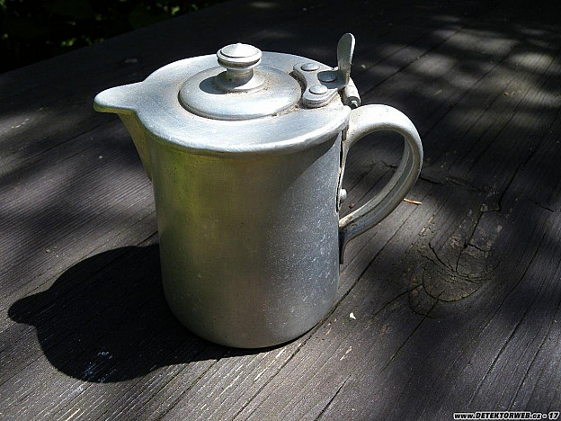 Počasí hledání někdy příliš nepřeje, tak občas na chalupě místo do lesa zamířím na půdu, konečně tam začít dělat trošku pořádek :-) zatímco déšť bubnuje do střechy, vyplouvají na světlo drobnosti nesoucí stopy dávných historií a životů. Myslím, že v hloubi letitého bordelu ještě nějaká zajímavost na své objevení čeká, tak zase příští dovolenou :-) Optika toho puškohledu se skoro rozpadla v rukou. V množství hliníkového nádobí byla i tato roztomilá konvička, nepozná někdo výrobce? Přeji nám všem vydařenější konec léta na počasí i nálezy.