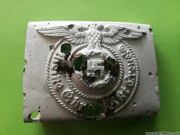 posílám foto mých nových nálezů. Je až s podivem, jak některé nálezy mohou být po tolika letech v zemi zachovalé, pokud jsou v bahně bez přístupu kyslíku. Přezka SS byla napadená morem tak, že mě nenapadlo nic lepšího, než ji fláknout přes noc do odrezovače namíchaného dle návodu tady z webu a modlit se, ať to dobře dopadne. Složení: kyselina fosforečná, dest. voda, butylalkohol a thyomočovina. Doufám, že jsem to napsal správně. Rakovina komplet zmizela. Přezka je trochu bělejší, ale možná časem trochu ztmavne. Jinak policejní opláchnutá pouze vodou a očištěna kartáčkem na zuby.