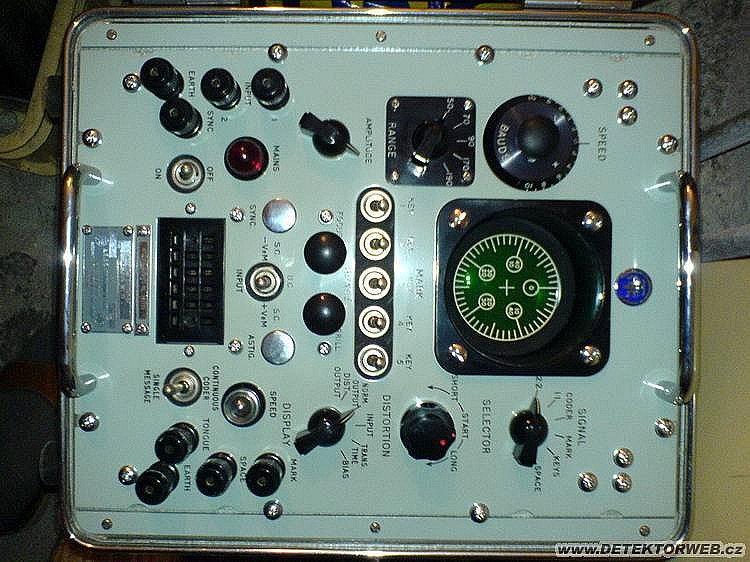 To kulaté zelené nahoře je obrazovka, nevím, co má ukazovat. Podle popisu na štítku se má jednat o nějaký kódovací telegrafní a telefonní ústřednu.