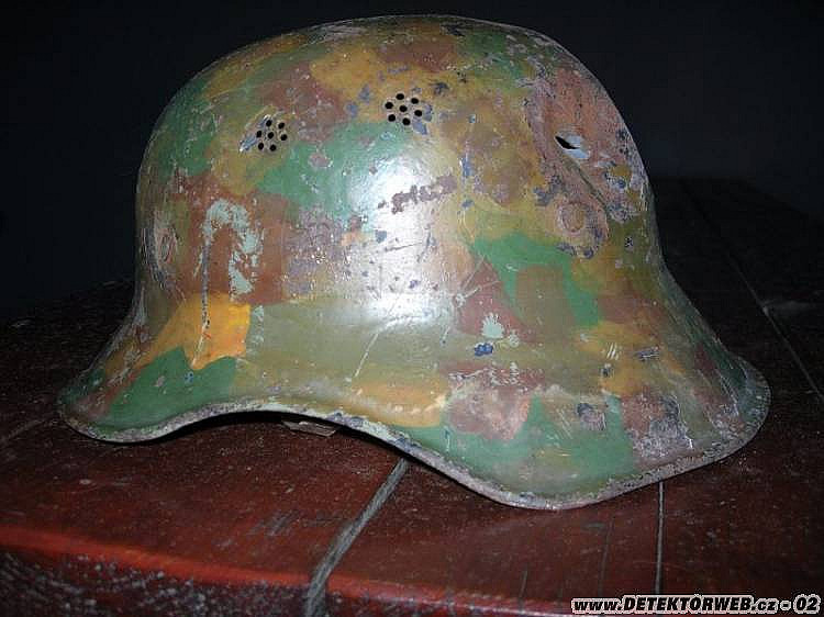 18. 05. 2016, 10:13Prilba M38 Gladiator I - jednodielna verzia. Je teda vyrobená z jedneho kusu plechu, čo nasvedčuje neskoršiu produkciu. Pribla bola využívaná príslušníkmi nemeckej civilnej protivzdušnej obrany Luftschutz, ako aj jednotkami Volkssturm. Neskôr po vojde bola v hojných počtoch využivaná bulharskou civilnou obranou. Tento exemplár nesie z vnútra pôvodnú nemeckú farbu, ale vonkajšia maskáčová farba je už nepôvodná. Vnútro a podbradník sú tiež pôvodné nemecké. Po akej zbrani je priestrel, to si ale netrúfam určiť. Počítam, že je tiež až z povojnových čias
