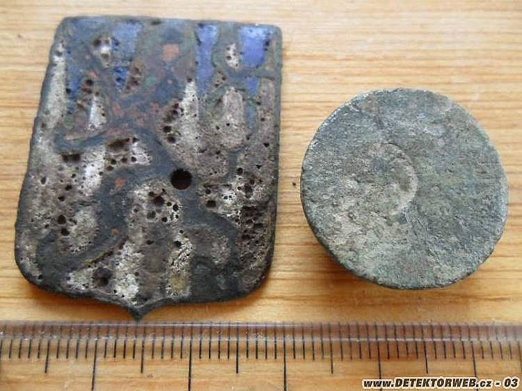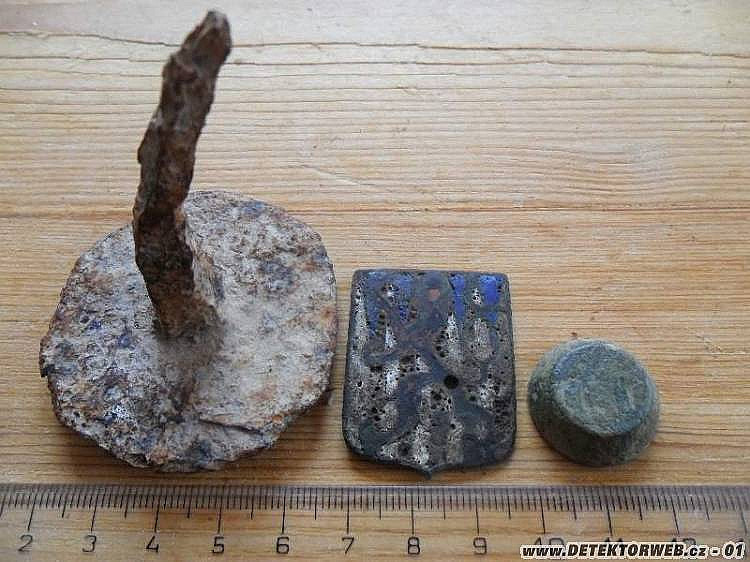 05. 03. 2013, 09:37Kámo první tři obrázky my připomínají za 1. nějaký hřebík za 2.Odznak české Armády ale trochu starší možná ČS armády (je na něm ještě zřetelný lev. a za 3. možná těžítko ale s tímto jsem se ještě nesetkal a za poslední 4 obrázky můžu říct za 1.kus koňských otěží z doby bronzové ale zaráží mně tvar a žádná koroze. za 2. římsky 4 a a 27 to mi připomíná knoflík ale nejsem si jist. za 3. ne až tak stará přezka na nějaký upínací řemínek. za 4. hliníková obruč s číslem -13- to by mohla být značka ale opět si nejsem jistý. Ale jinak pěkný nálezy.