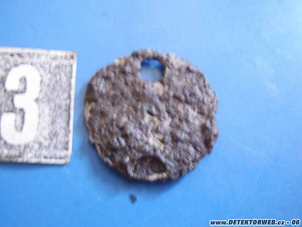 Na těch panských lukách, našel jsem já dukát. Tak nějak začíná lidová píseň, ale nějak se mi tam zrovna nezadařilo. Našel jsem tam jenom nějakou větší placku /asi Ag/. Mince to asi není, ale moc by mne zajímalo o co jde. Dále prosím o určení přívěsku, který je hodně po smrti, ale reaguje na magnet. Já tam vidím z jedné strany č. 9 a z druhé u horního otvoru snad č. 10. Nebyla to robotní známka? Co myslíte? Ještě bych rád věděl něco o knoflíku, snad to je erb? Děkuji předem všem za odborné posouzení a posílám srdečné pozdravy z naší krásné Vysočiny Ať to pěkně pípá.
