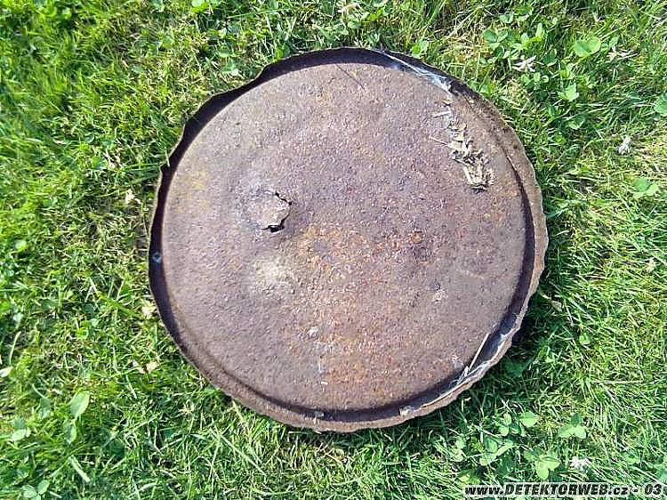 09. 07. 2012, 11:01Víko plechové konve od barvy kterou lesníci natírali špičky stromků proti okusu zvěří.