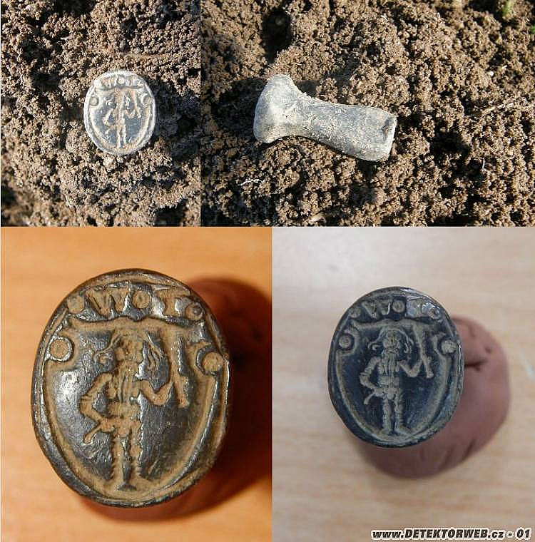 25. 10. 2014, 08:22Tak mám další možnost určení : Jedná se o osobní pečeťítko signet. Dataci lze položit do 17. - 18. století. Pečetítko je odlito, pečetní plocha dorývaná. Na pečetní ploše je znázorněna postava rytíře v rolverkovém štítu, což patrně poukazuje na stav vojenský či rytířský stav majitele. Nad štítem se nalézají iniciály "ligatury" F. W. patřící majiteli pečetítka. Tento typ pečetítka se vyskytuje poměrně často právě v sedmnáctém a osmnáctém století, kdy symbolika není již tak závazná a dodržování stavů tak striktní jak tomu bývalo ve středověku proto nelze připsat pečeť konkrétnímu stavu. Co bylo v osmnáctém a později devatenáctém století obvyklé byly filiální erby, erby koupené od skutečné šlechty zbohatlým středním stavem. U nás byly Windischgrätzové, ale nevím...