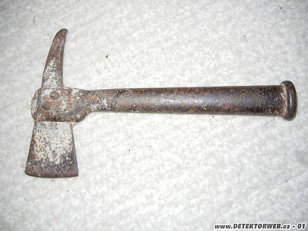 24. 10. 2013, 10:45Hasič to určitě není. Sekerky pro hasiče měli v době kolem 1.sv. války jiné tvarování. Navíc u hasičů se nikdy (budeme-li vycházet z toho, že je to originál a né samodama úprava) nepoužívaly topora z kovu. A k prvním komentářům. Nejedná se ani o konec trhacího háku. Ty jsou tvarované úplně jinak (jedna strana špička, druhá zahnutý hák).
