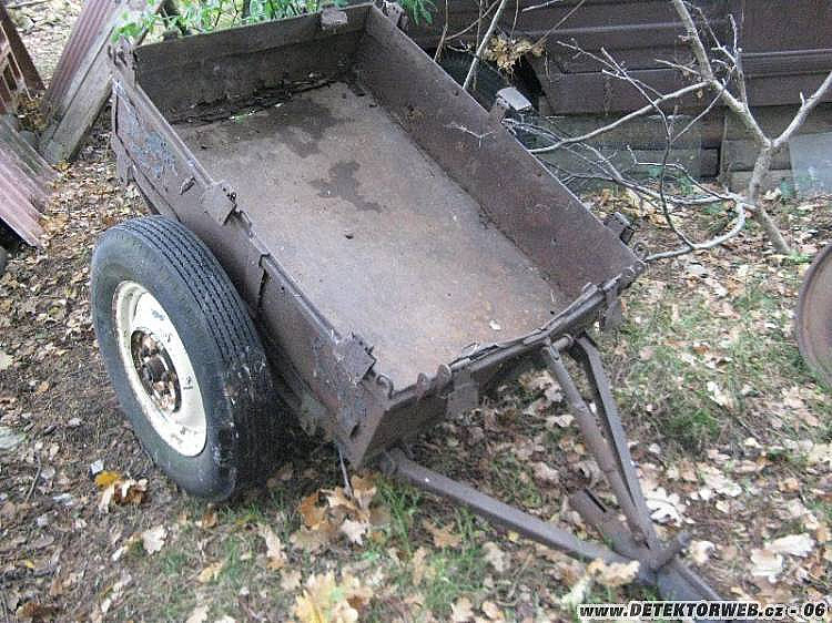 Marně se snažím získat informace o přívěsném vozíku, který údajně používala německá armáda za 2. sv. války. Na vozíku je hlavně zajímavé to, že má sklápěcí kola. Zvyšující boky vozíku byly z překližky, jejíž zbytky jsou v pantech. Vozík byl kdysi předělán na jiná kola, pravděpodobně z Robura a byl na něm přidělán masivní, litinový úchyt na kulový závěs. V dostupné literatuře jsem zatím nic podobného nenašel, uvítal bych jakoukoliv informaci, o co vlastně jde. Vozík nemusí být původně ani německý, ale za války jistě používán byl.