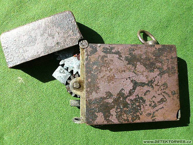 Zapalovač s mechanismem, kdy se při otevření zároveň škrtá.