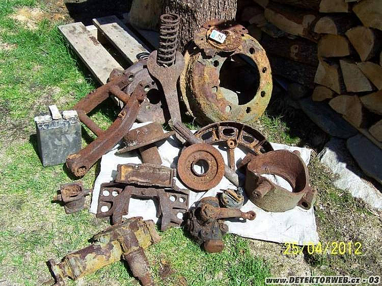 30. 04. 2012, 16:17No tyhle součásti se v konstrukci vozidel používaly desítky let takže s tím válečným původem bych byl opatrný. Ta houpačka - kruhová součást s čepama vypadá jako úchyt majleru na sklápění vleku, velký brzdový buben a pakna může být taky vlek. Pákový tlumič, převodka řízení, spojková lamela a klapka motorové brzdy může být každý z něčeho jinýho ale taky nemusí. Vypadá to jako úklid kolchozní dílny kdysi dávno...