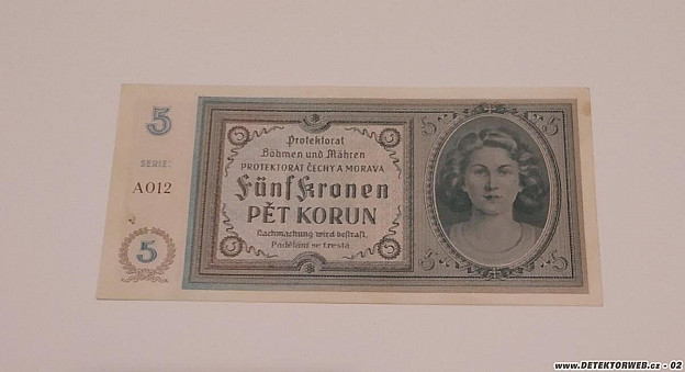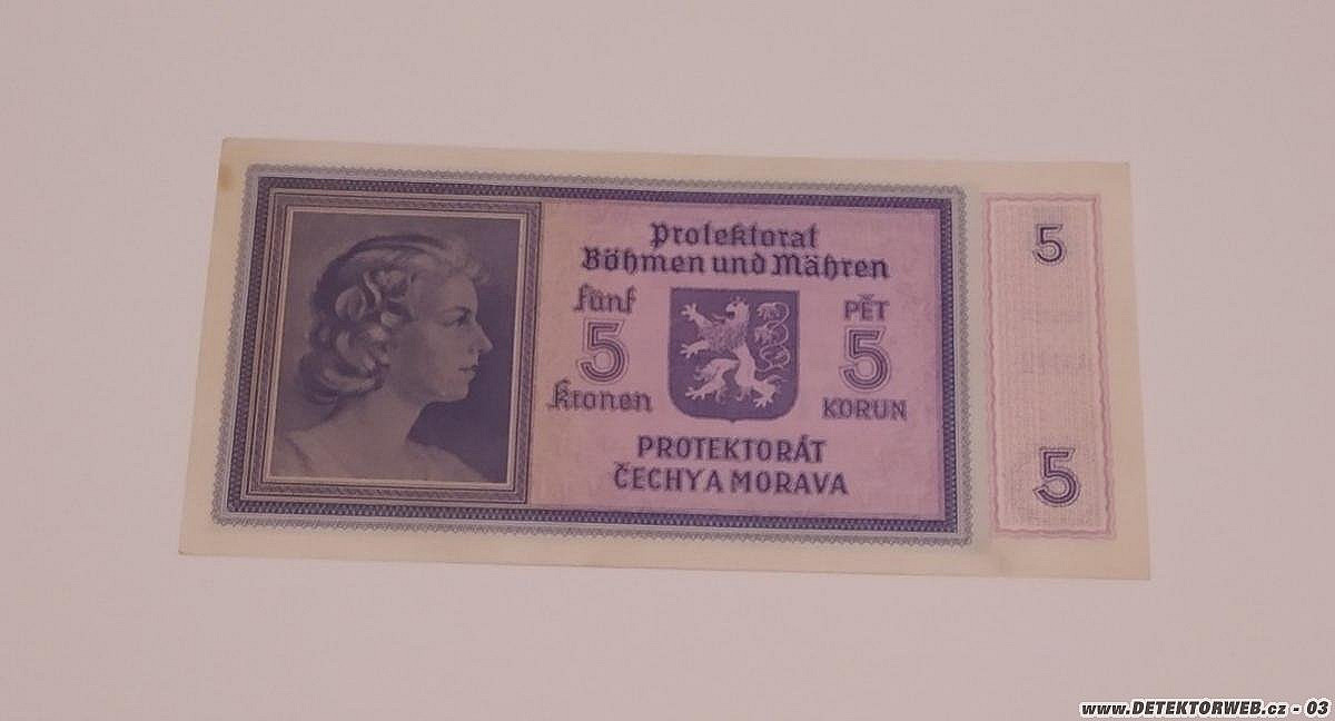Vyfotil jsem i docela zachovalou protektorátní pětikorunu, kterou jsem našel už někdy v polovině 80. let v bouraném domě u nás v obci. Bylo to hned u autobusové zastávky a tak než přijel autobus, aby nás odvezl do školy, chodili jsme s kamarády na lov.