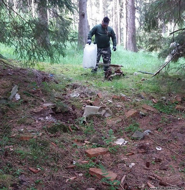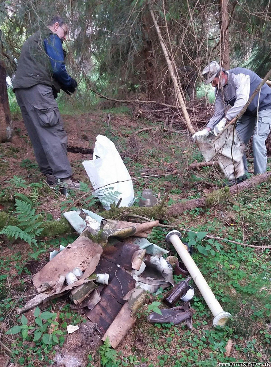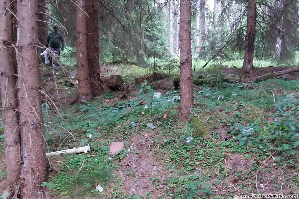 K místu nepořádku jsme se dostali po pěkné cestě. Předseda klubu Václav Vobořil předal každému hledači silný igelitový pytel na odpadky. Rezavé plechovky svědčily o tom, že tam zůstaly po prvním umístění roty. Jako i na jiném místě staré PS roty, kde jsme dříve uklízeli, tak i zde se odpadky sypaly ze stráně. Když byl určený prostor uklizen, hledači odpadky nacpali do pytlů a vydali se naplnit přívěsný vozík. Vozík byl naplněn, hledači vzali detektory a vrhli se na vyčištěný prostor. Zde jsme našli jen pár vystřelených nábojnic. Přestalo nás to tam bavit, tak jsme se věnovali každoroční příjemnější činnosti. Při zpáteční cestě po turistické značce jsme minuli pěkné dřevěné sousoší. Cestou domů jsme se ještě podívali na starou leštírnu skla nedaleko Staré Knížecí Huti.