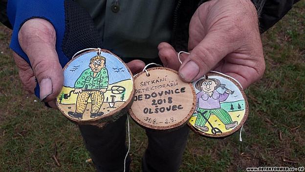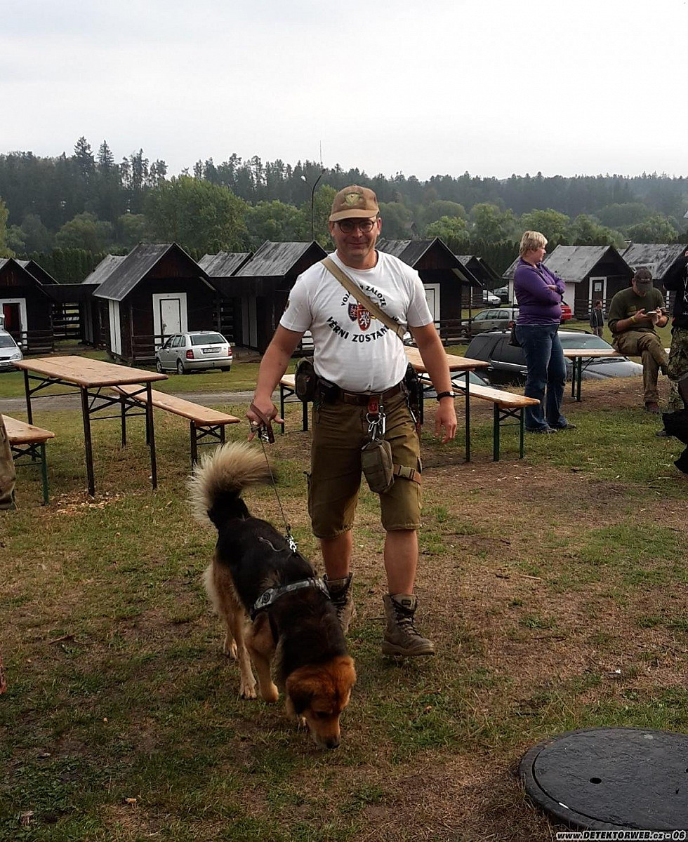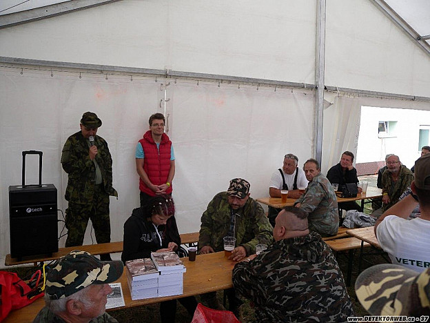 ... začaly objevovat v kempu i nové tváře hledačů z celé republiky i ze zahraniční - Kašu a Grega z Polska už určitě můžeme počítat mezi veterány, o to je vždy shledání srdečnější. A svým způsobem je už veteránem, tedy spíše veteránkou desetiměsíční Markétka, pro kterou to byla již čtvrtá!!! účast na našich setkáních (dvakrát tedy ještě v bříšku maminky, ale to se podle nepsaných stanov našich setkání počítá, neboť podle pediatrů se už v této době formuje kladný vztah k detektorům :-) Milým účastníkem byl i Arnošt Bechr, kterého znají čtenáři Detektor revue jako vtipného kreslíře a v právě vycházejícím čísle DR ho poznáte i jako zaníceného hledače, kterému se poštěstily během jednoho dne dva depoty. Pro účastníky setkání připravil skvělé pamětní – jak je nazývají trempové –camradla. Když se ho ptal Mirek UC Kratochvíl, proč má na pravé ruce ortézu, s úsměvem odpověděl: „Tři dny jsem jen kreslil tyhle camradla. “ Postupně se rozeběhly registrace a ubytování v chatkách, bungalovech i stanech... Oproti jarnímu setkání ve Sloupu, který počasím připomínal spíše letní Sicílii než severočeskou obec, předpověď na jedovnický víkend strašila přeháňkami i bouřkami. Vše se tak nějak vyplnilo, ale naštěstí především po ránu, večer a v noci, takže sobotní soutěže mohly proběhnout nerušeně, včetně „koupací“ disciplíny – „plechového kaprobraní“ probíhajícím na rybníku Olšovec. Ale jak známo, účastnící našich srazů jsou přírodou zocelení, takže ani déšť na náladě neubral... A nakonec pod střechou prostorného stanu se také dobře rokovalo a popíjelo. A v zdánlivě předem prohrané bitvě člověk–oheň versus příroda-déšť, který neúnavně sváděl „husquarna“, nakonec „český voják opět slavně zvítězil“. Stejně jako v Protivanově někteří neodolali a zkusili své štěstí na dně rybníka. K večeru se tedy pěkně rozhořel tradiční táborák, zapěnila pípa, zavoněly prskající klobásky a už jsme mířili na první ze zajímavých přednášek připravených na toto setkání. Téma – Štěchovický poklad – samozřejmě naplnilo stan, kde se přednáška konala a poutavé podání Martina Tomana si vysloužilo velký závěrečný potlesk, byť někoho mohl zklamat značně skeptický názor Martina na existenci pokladu. Ráno nás probudilo do deště, ale než došlo na uvítání účastníků setkání Miroslavem UC Kratochvílem, nebe dostalo rozum. Poté dostali příležitost ti, které zajímaly novinky od značek Technetics, XP a Makro, či prostě chtěli s UCem a Jakubem probrat fungování a nejlepší nastavení jednotlivých detektorů. O sobotním dopoledni přišly na řadu nejprve soutěže. Na druhém protivanovském setkání hledačů pokladů s Detektorwebem v roce 2014 měla premiéru nová soutěžní disciplína nazvaná: „Dálkově řízený archeologický průzkum“. Většina účastníků již tedy věděla, jaká jsou pravidla: úkolem „archeologa“ (v předešlých ročnících sedícího na své židli v teplíčku "kanceláře", v Jedovnici posazeného přímo „do terénu“, tedy na zem), který dostává do bezdrátových sluchátek signál z cívky hledačova Deuse, je pomocí provázků a povelů řídit hledače, který má zakryté oči, aby v trávě ve vymezené dráze nalezl v co nejkratším čase tři volně ložené cíle (mosazné matice) a překročil jednu překážku. S nadsázkou si soutěžící mohli vyzkoušet, že ne vždy to s námi hledači má archeolog jednoduché. A i obráceně, že hledači některým archeologům nerozumí. Nakonec se, ale ukázalo to hlavní, že spolupráce je přínosem pro obě strany.