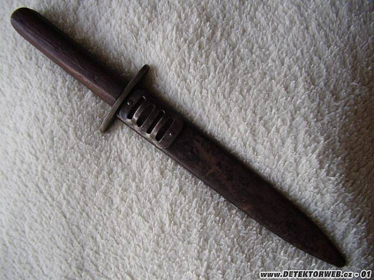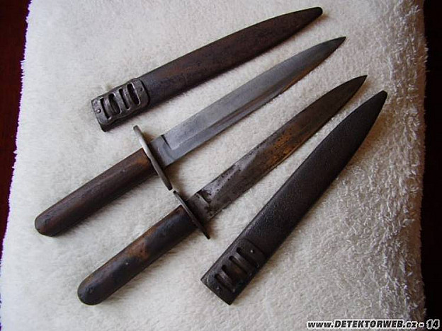 jinak jsou 2 druhy pochev, jedna je ta, co jsou na obrázku, další typ je delší a má místo otvorů v plechu, 2 ocelové dráty na kterých byl závěsník, mám 3 tyto mrkve, to, že jsou čepele různě dlouhé, mě nepřekvapuje, to může být zbroušením, ale oni i rukověti mají různé rozměry, inu, co kus to originál