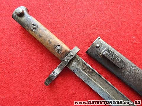 Čepeľ je však vo veľmi peknom stave, áno je na nej poznať zub času, ale myslím si, že na celkovej atraktivite jej to neuberá. Bodák bol vyrobený zbrojovkou v Budapešti, o čom svedčí značenie "F. G. G. Y" a na strane druhej je rakúsko-uhorský orol. Drevená rúčka má prekvapivo stále peknú kresbu, drevo sa nedrolí a je stále pevné. Uzamykací mechanizmus funguje bezchybne aj po úctyhodných 110 rokoch. Žiaľ na puzdre sa dochovali už len nepatrné zvyšky pôvodnej čiernej farby. Našťastie, aj keď bolo v móde puzdra bodákov farbiť čiernou alebo inou farbou, nepodľahol som tomuto trendu a tak je bodák stále v pôvodnom stave. Zaujímavosťou je, že týchto bodákov s muškou sa na karpatskom bojisku našlo veľmi málo, rovnako aj povalové nálezy boli skromnejšie na tento typ. Bodáky s muškou boli určené pre krátku pušku, ktorou boli vyzbrojené napríklad oddiely ženistov, zdravotníkov, delostrelcov, vodičov nákladných vozidiel, ostrahy objektov a podobne.