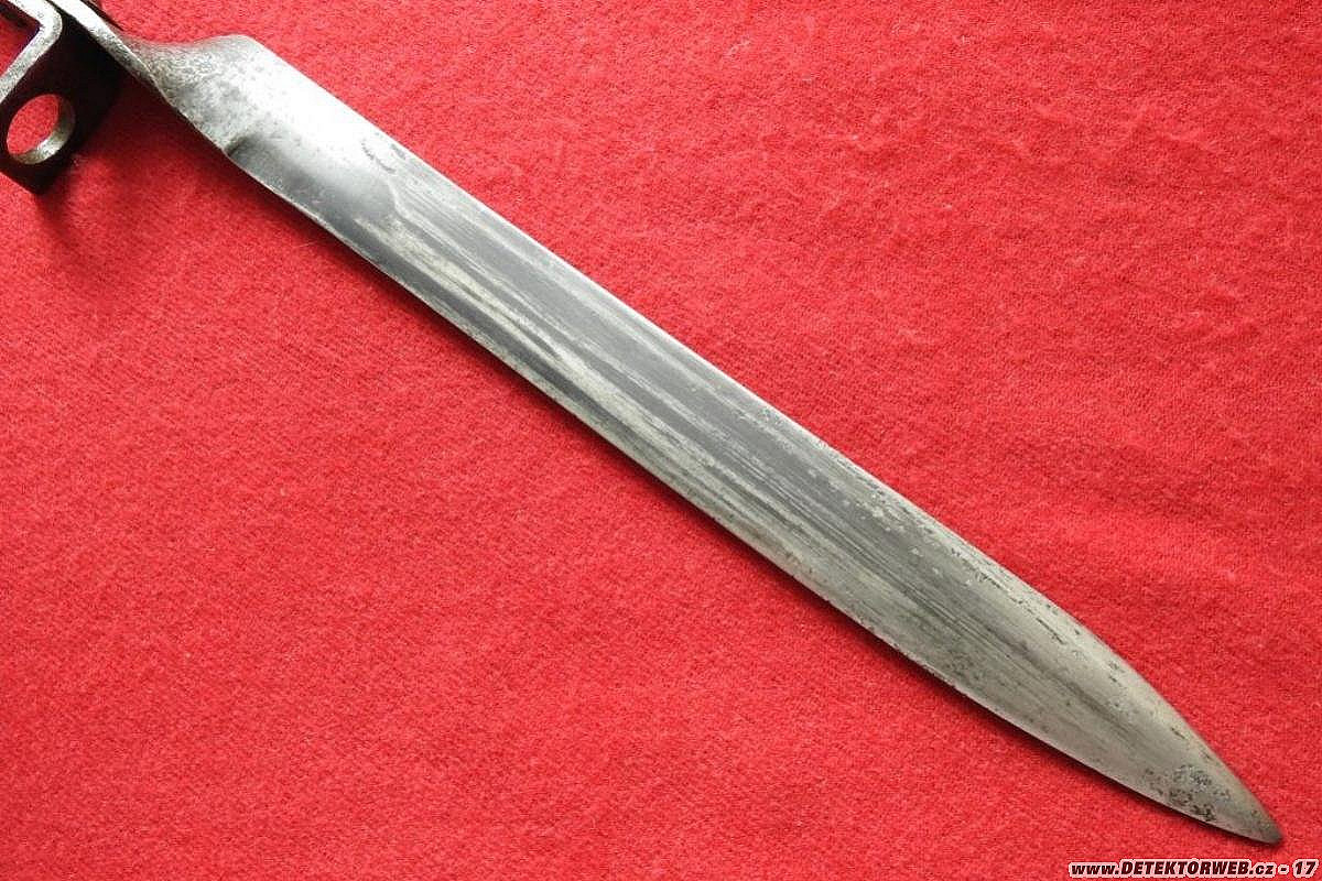 Bodák, ktorý môžete vidieť na fotkách je v nedotknutom stave. Nie je brúsený a očistený bol len od špiny, prachu a jemnej hrdze, ktorá sa na ňom za roky prichytila. Konštrukčne je bodák riešený veľmi jednoducho, čepeľ je z jedného kusu valcovanej ocele, ku ktorej je dvoma mohutnými nitmi prichytené očko na hlaveň s priemerom 15 mm a kúsok plechu, ktorý slúžil ako jednoduchý uzamykací mechanizmus. Zaujímavosťou je to, že bodák má aj povrchovú úpravu, pretože puzdro nie je farbené, ani lakované, ale morené načierno, rovnako ako celý bodák. Nejde o čiernenie, ale skôr by som povedal o lacnú a jednoduchú alternatívu. Najlepšie je to vidieť na čepeli, ktorá nesie ešte asi 75 % tejto povrchovej úpravy.