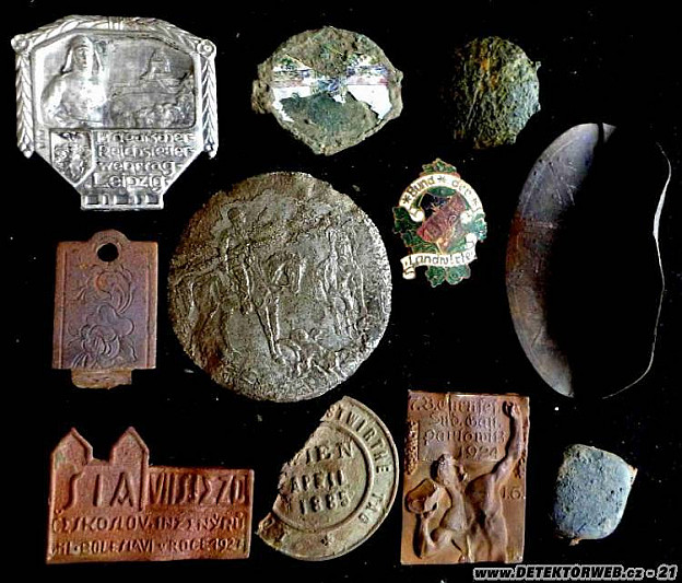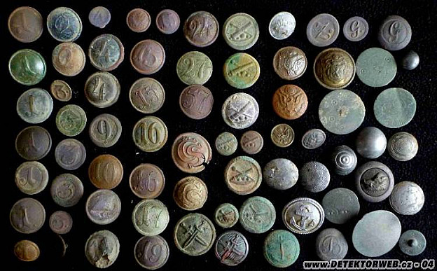 No a při hledání jsem vydoloval 364 ks mincí, z toho 33 ks Argentum a jednoho římana, 1139 knoflíků, 427 plomb, 20 svátostek a křížků, 5 prstenů, 4 psí známky, desítky víček od fajek, 8 drůbežích známek a 2 ptačí kroužky, desítky přezek botních a oděvních, 3 vojenské přezky a 5 čepičáků, límcové značení, 25 ks vojenských a civilních odznaků, 3 ks medailí, 1 pečetítko a 2 pečetní prsteny, 3 dělostřelecké časovače, 9 klíčů k hodinám, několik koňských faler, 6 desítek nábojnic, 9 ks závaží, stovky olověných kulí (z předovek a šrapnelů), na 8 desítek olověných střel, asi 15 kg olověného odpadu, asi 8 kg Al odpadu, kolem 300 kg železného šrotu a nějaké další ufa, úlomky a neidentifikovatelné všehochuť.