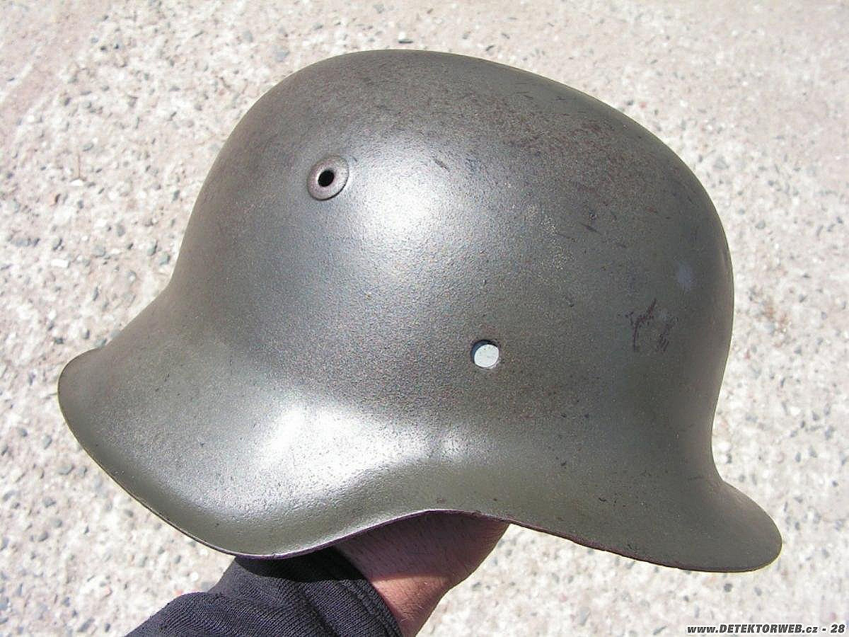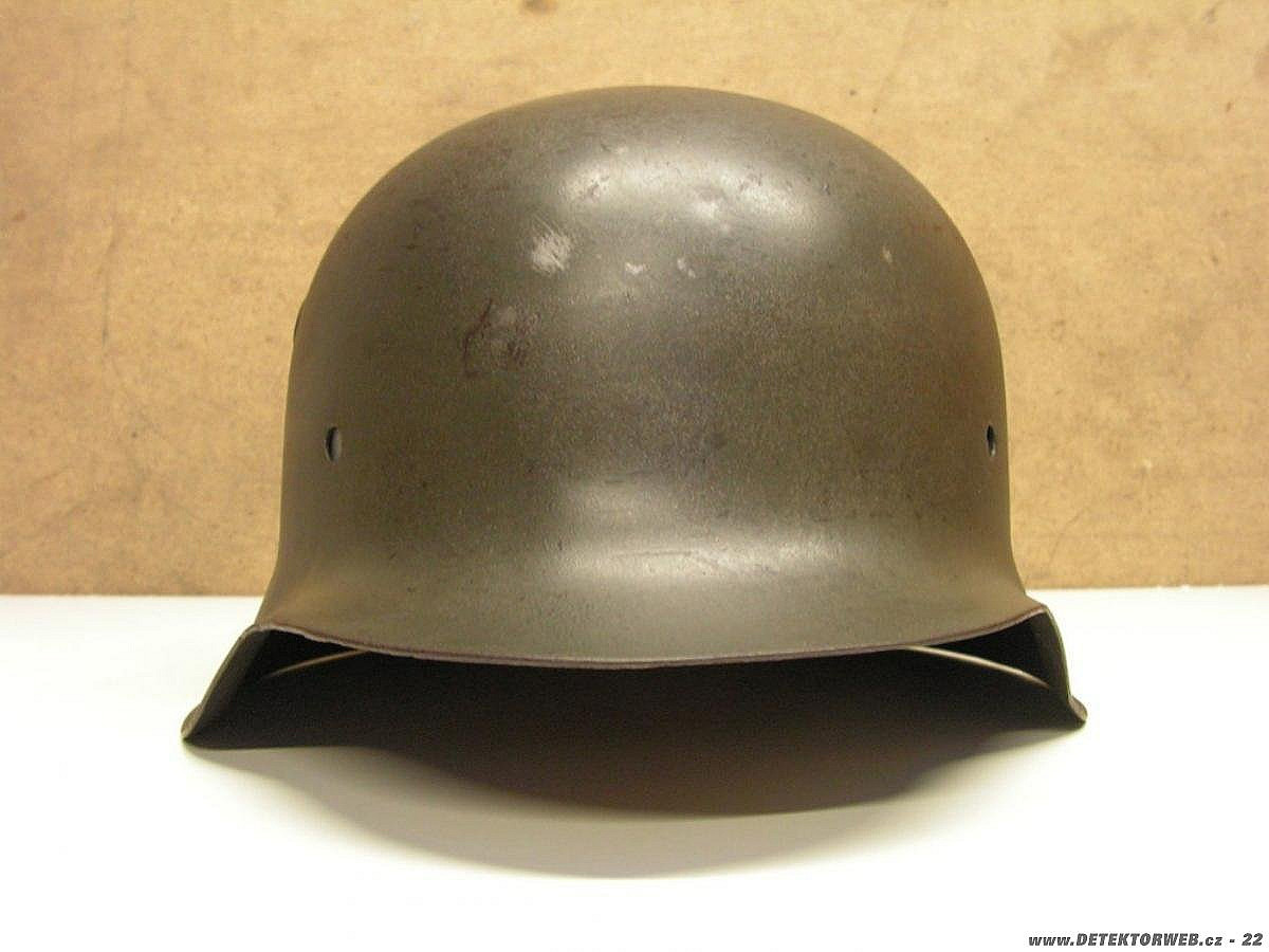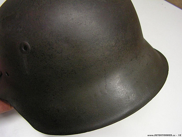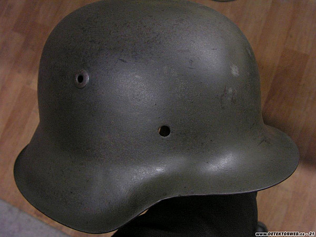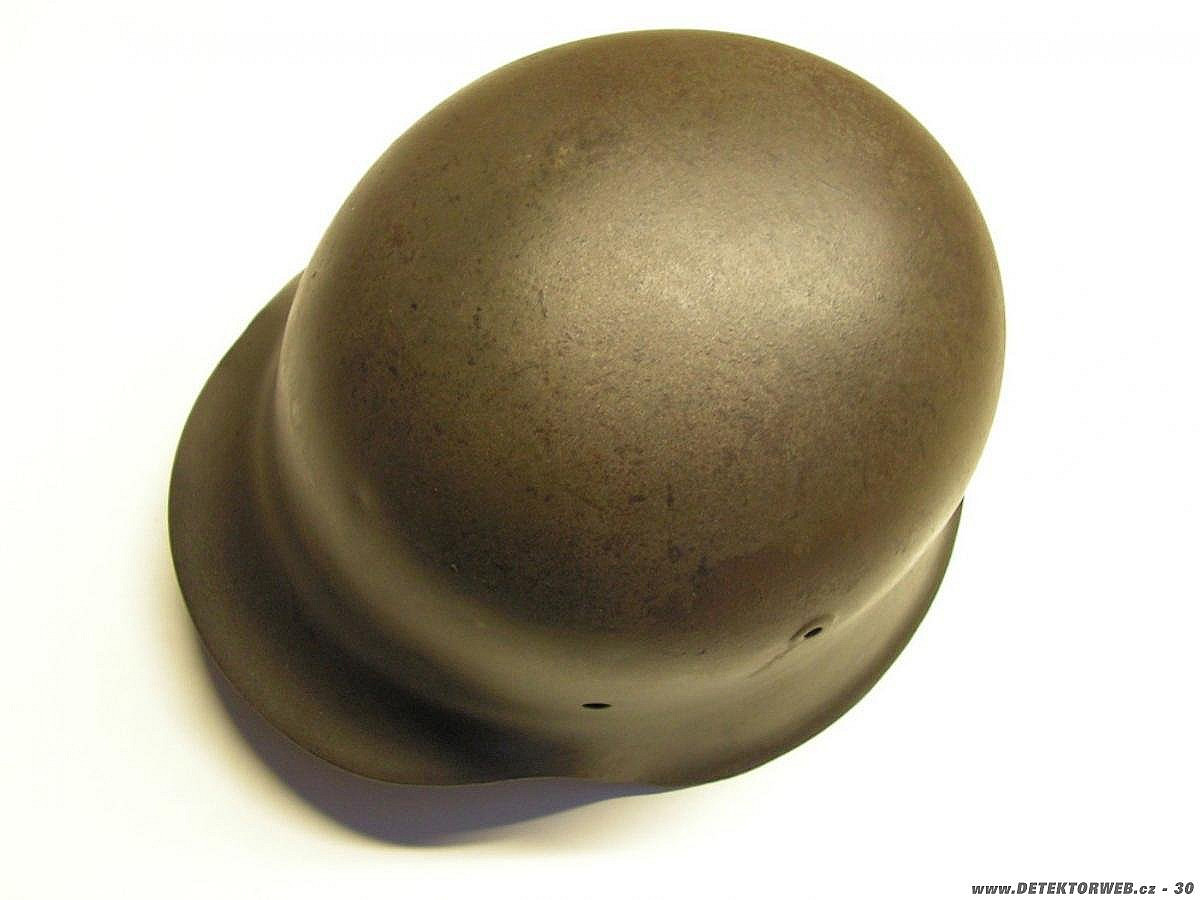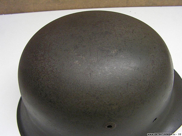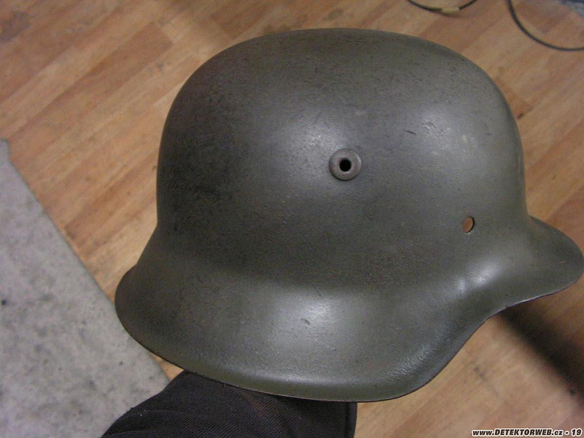 Zdar všichni, tak se mi do rukou na očistu dostal jeden starý hasič s origo vnitřkem. Kamarád ji měl doma na půdě asi tak 25 let. Získal jí tak, že jako mladý, když makal v místních pekárnách, tak jednoho dne dostal za úkol vyklidit starý sklad CO. Měl vzít Avii valníka a všechny staré helmy, masky a nějaký další bordel ze skladu odvést do šrotu. Tahle helma prý byla to jediné, co si z celého kontasu tenkrát nechal. A to mi říkal, že těch helem tam pak bylo asi cca 3/4 kontasu :-o No jo no, co člověk nadělá, jeho to dřív nějak dvakrát moc nebralo a hlavně ještě tenkrát ty helmy nebyly za takový prdy jako teď.No a teď k helmě. Jestli se nemýlím, tak by to měl být vzor M42. Na očištění jsem se inspiroval vašimi radami s odlakovačem nehtů a musím říct, že to fungovalo perfektně. Pod černou vykouklo asi tak 70% původní barvy WH. Sám jsem byl překvapený s výsledkem. Ted už mu jen sháním origo cvoky a podbradník.