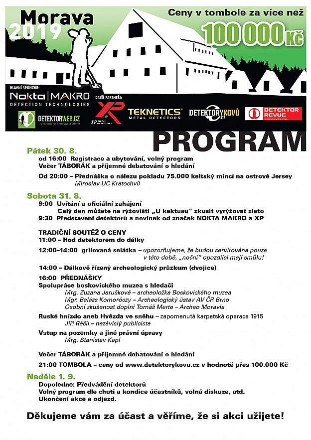 Z témat chystaných přednášek na sobotní odpoledne prozradíme, že se můžete těšit třeba na archeoložku z Muzea regionu Boskovicka Mgr. Zuzanu Jaruškovou, která společně Mrg. Balázsem Komoróczym představí projekt nesoucí název Spolupráce boskovického muzea s hledači a zcela jistě se dostane i další témta spojená s detektory kovů a archeologií. Dále na doslova adrenalinovou cestu do polských Karpat po stopách jedné zapomenuté, ale naprosto výjimečné operace první světové války v podání Jiřího Ráčila (Acci). Přednáška nese název „Ruské hnízdo aneb Hvězda ve sněhu“. Mgr. Stanislav Kapl uvede přednášku na téma Vstup na pozemky a jiné právní úpravy, abychom věděli, co je a co není přípustné.