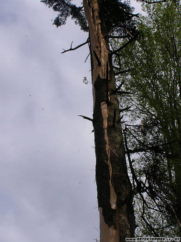 K autu jsem naštěstí doběhl ještě než se rozpršelo, takže jsem se hezky pohodlně usadil a koukal se ven, i když to vzhledem k zamlžujícím se oknům nebyl nic moc výhled, když se najednou zablesklo, že jsem chvíli neviděl vůbec nic a zároveň se ozvala rána, až auto poskočilo. No řeknu vám, že nesedět v autě, tak bych asi potřeboval přebalit, jak jsem se leknul. Když jsem se trochu vzpamatoval, tak jsem otřel zamlžené okno, a co jsem uviděl, je na fotkách. Využil jsem krátké přestávky v dešti a vyběhl to nafotit zblízka. Bohužel mi po jedné fotce chcíply baterky ve foťáku, takže jsem ve středu vyrazil na ono místo znovu a nafotil ten strom ze všech stran. Je až neuvěřitelné, co s ním ten blesk udělal. Jen dodám, že jsem s autem stál od toho stromu necelých 30 m. Mám pocit, že při mě stáli všichni svatí, protože nebýt v autě, ale někde venku v tom lesíku, tak možná mohlo být tohle hledání moje poslední. Dávám to sem jen na pár dní na pokuk, pak to nechám smáznout.