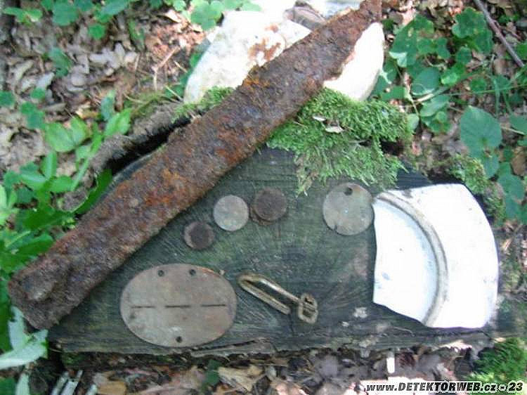 Mimo tyto nejzajímavější nálezy ze smeťáčku vypadly ještě běžné věci jako hlinikové kalhotové spony, kokardy na brigadýrku LW, různé knoflíky k uniformám, části gazmasky, mince, sleněné lahve, železné přezky LW. Bohužel většina kovových věcí je již téměř po smrti. Vše kopáno při teplotách nad 30°C a za neustálé asistence komárů, tak to beru jako zasloužené vítězství, i když si v duchu říkám – za tu dřinu tam toho mohlo být víc. No nic třeba příště……Známka, talířek, lžička a Focke Wulf za to stály.