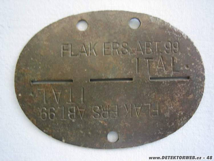 Druhý den padly nějaké Winterhilfe. Skleněný Beethoven, plastový letoun He 111 a knoflík Kreigsmarine. Třetí den přišlo moje vytoužené letadélko wiking FW 190A (to bylo opravdu hluboko), zbytky Savoia-Marchetti a křídlo Cataliny PBY. Poslední den téměř na konci jáma vydala nerezovou lžičku s logem firmy J. A. Henckels Zwillingswergs, pochvu na německý bodák k Mauseru K98k a v zápětí KONEČNĚ (!!! ) ID známku v super stavu FLAK ERS. ABT. 99 ITAL. Ležela v písku na samém okraji jámy jen pár centimetrů pod povrchem. Tentokrát radost neznala mezí. Letos je to teprve moje sedmá ražená známka (v tomhle stavu třetí) a to běhám pilně po Vysočině a byl jsem i v Lotyšsku.