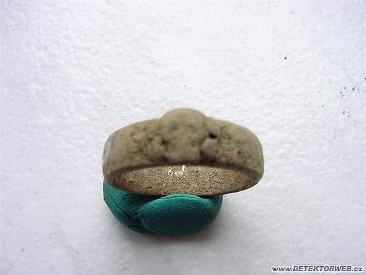 Kdyz uz jsme u tech fotografii (aranzovani), tak mi nesedi ani paty a treti obrazek odspoda. Tyto snimky jsou foceny evidentne az doma (ubrus), pricemz na prstenu je stale nanos hliny. To jako kdyz ho nalezce nasel, tak ho na miste nenapadlo ho aspon trochu ocistit/otrit nebo na nej aspon plivnout (na lebku), aby zjistil co to vubec nasel? Ze ho s nanosy hliny uz prinesl domu, pak ho (doma) nejdrive posadil do modeliny a peclive nafotil, a az teprve pak se ho snazil ocistit? Tohle prece neni normalni a prirozeny chovani beznyho nalezce. . Z hladkych ploch takoveho stribrneho prstenu by prece musel jit tento typ zatvrdle hliny/jilu sloupnout velice snadno (napr. pouze nehtem). Pokud by byla zem/jil pri nalezu vlhka, tak by ho prece kazdy nejdrive aspon trochu otrel.