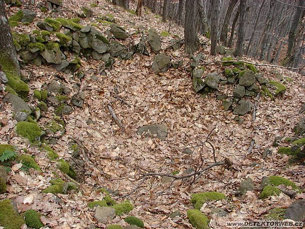 Pri jednom strome bola pekna kopka crepin a nedalo mi si ju neodfotit... Nase hladanie pokracuje po malej prestavke/posedeni v zakope na vrchu, ala wehrmacht... S vynimkou ze wehrmacht nejedol rozky a nepil mineralku ako mi :) Ide sa dalej, pomaly z nas steka pot no tuzba po peknych nalezoch nas zenie dalej. Stale nic a nic... a zrazu signaaal a vonku vykukli naboje mosin v pokrocilom stadiu korozie. Tak tam aj zostali... par metrov dalej sa ukazovali uz nabojnice rozneho kalibru a dokonca aj mosadzne tak sup snimi do tasky a ide sa dalej. Zdolavame dalsi kopec. Tam sa nam ukazuu velke zakopy obkladane balvanmi a to znamenalo moznost a nadej ze nieco pekne s pod zeme vykukne.