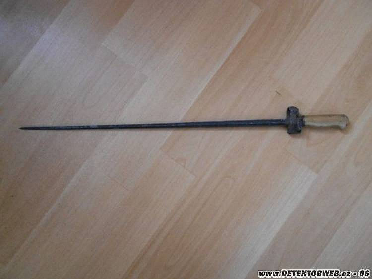 posílám na pokuk pěknej kousek, kterej se mi podařil. Byl zapíchnutej v kopečku, takže voda nevtékala do pochvy, ale stékala po ní a tak čepel přežila. Pochva a Mosin jsou po smrti, ale bodlo ještě parádu na boudě udělá. Mám radost, že je čepel celá, viděl jsem jich fůru zkracovanejch.