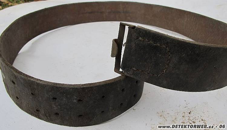 V klubku ještě byl další nejspíš vojenský opasek, tentokráte přetržený. A když už je téma staré kůže, tak jsem zahrabošil ve starších nálezech. Mám tu netknutý černý opasek značený na kůži R. B. , pak evidentně vojenský pásek značený pouze čísly, pak řemení z baťohu s karabinkami značenými písmeny D a C a řemení s karabinkou značenou SC a na kůži nacistickou orličkou. No a nakonec jeden řemínek zřejmě na sepnutí celty k velké polní.