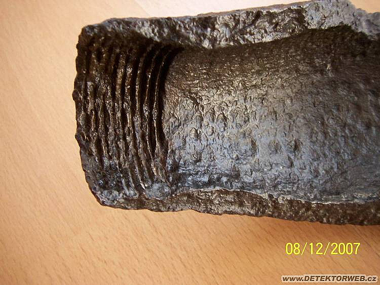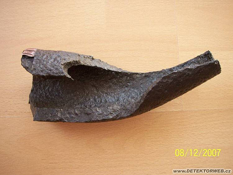 11. 12. 2007, 11:46Je to crepina z hornej casti bezneho triestiveho delostreleckeho granata. Bol vystreleny a po naraze explodoval. Tam, kde je vidno cast zavitu, bol zapalovac a mas tam este aj kus medeneho tesniaceho kruzku, na ktorom vidno sikme ryhy po drazkach z hlavne dela.
