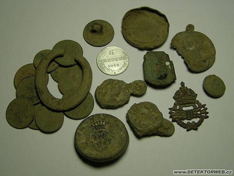 Opět zdravím všechny hledače, konečně se mi po delší době poštěstilo. Počasí bylo jako stvořené na hledání a tak jsem neváhal ani minutu, sbalil nádobíčko a vyrazil na nejbližší pole za vesnicí. První nálezy, stály zanic nejčastěji to byly klasické 5 a 10 h z ČSR a sem tam nějaký odpad. A pak to příšlo nádherný signál, kopu a ze země tahám malý stříbrný šesti krejcar. Radost byla obrovská a přeji tento pocit každému zažít. Po nějaké době jsem ještě vykopal pár mincí, 2 plomby, zajímavý knoflík s erbem a RU odznak.