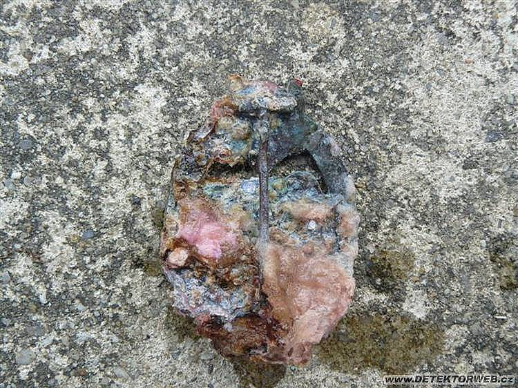 Ahoj všem. Dneska bylo pěkný počasí, neváhal jsem, popadl klandr a vydal se na jedno už prochozené místečko. Stálo to trošku nervů, všude samej čedič a detektor byl jak urvanej. Při zpáteční cestě k autu najednou podivnej signál. Trochu váhám nakonec hrabu a koukám, v díře sklenice. Proklínám bordeláře, ale sklenici nakonec vytahuju. Koukám na ní, místo železnýho víčka, už jenom zbyteček, a nahoře nějaká zatvrdlá hmota. Říkám si, hm, zase nějaká zaschlá barva. Sklenici trochu očišťuju, na ní nápis "Pravý český včelí med". Tak v tuhle chvíli to totálně vzdávám, už jí chci zahodit zpět do díry, ale koukám, blyští se uvnitř nějaký předmět. Zpozorním, prohlížím to, nějaký podivný kolečko, mince to není, možná nějakej knofl, pak koukám, čumí na mne kůže. Teď si říkám, rakev zesnulýho mazlíčka s dárkem na poslední cestu. Sklenicí třesu, něco uvnitř rachotí. No beru jí domu, zde fotím v původním stavu, pak balím do hadru a následuje lehká rána nožíkem. Po rozbití valím voči. Celkem tedy: 2x stříbrné cibule, 1x asi pozlacenej řemínek k hodinkám, 1x asi stříbrnej kristus na bakelitovým kříži, 1x rozmočená krabička a v ní: 1xEK2 1939 i se stužkou, pak tankán a "zmrzlík".
