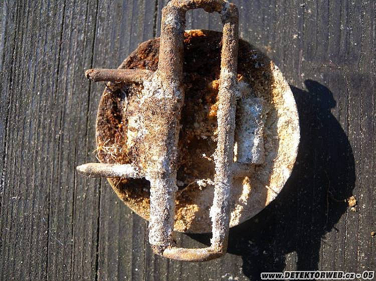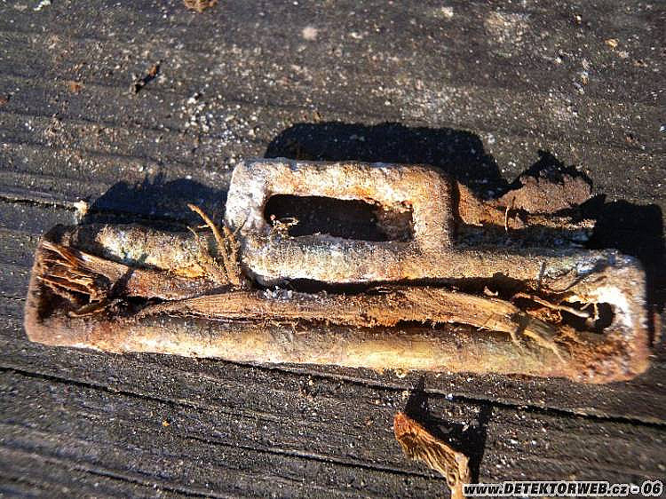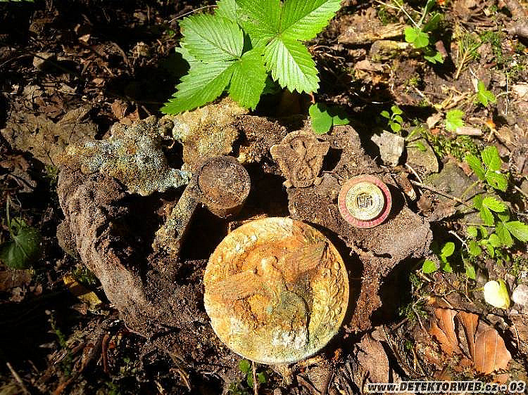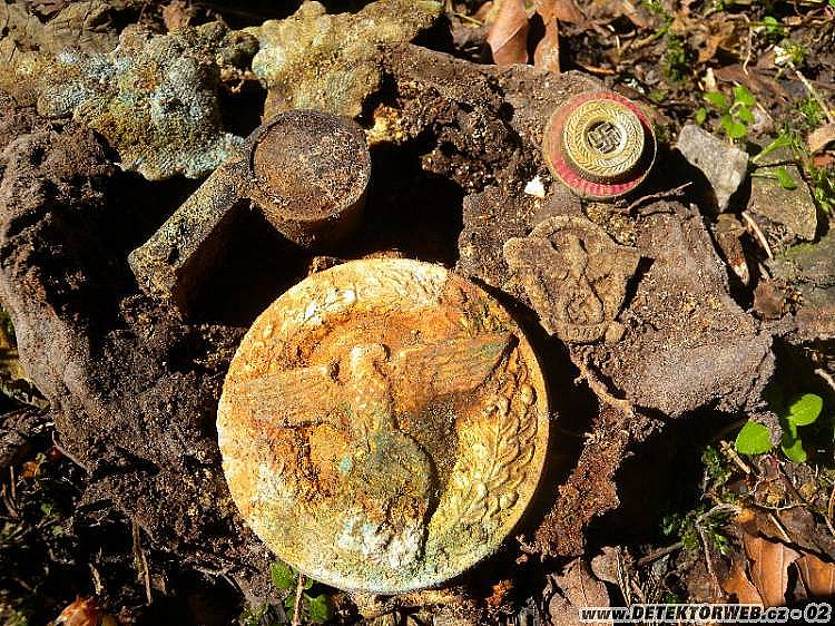 Hoďku dvě jsem kroužil kolem, vyhrabával plechy a železa, sem tam knoflíček a měďák... Až na malé plošince v mírném svahu se ozval nadějný zvuk a očekávání se stoprocentně naplnilo: z mělké hrabanky se vyloupla kožená brašnička, hned se mi začala rozpadat v rukou a z té změti vypadla přezka politického vedoucího, rozpadlá kokarda, odznáček hitlerjugend, píšťalka a odznak, který tu kdysi Kajman1 (díky :-) určil jako winterhilfku vydanou ke Dni německé policie v roce 1942.