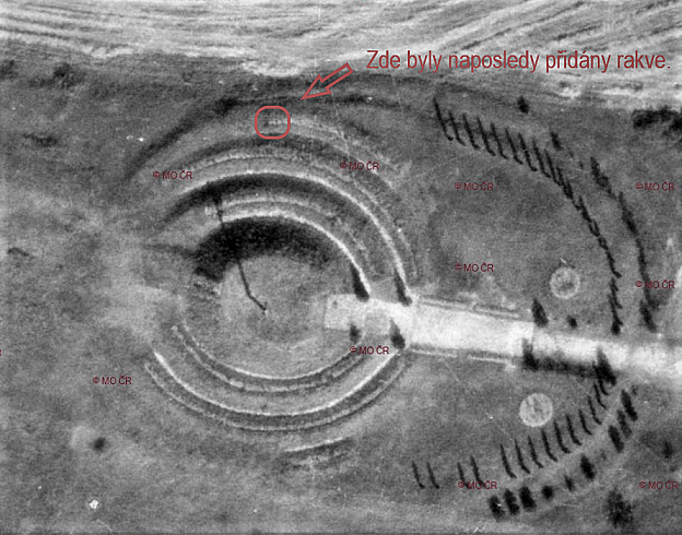 Letecký snímek Mohyly z roku 1963. Nad rakvemi byly vysázené řady růží.