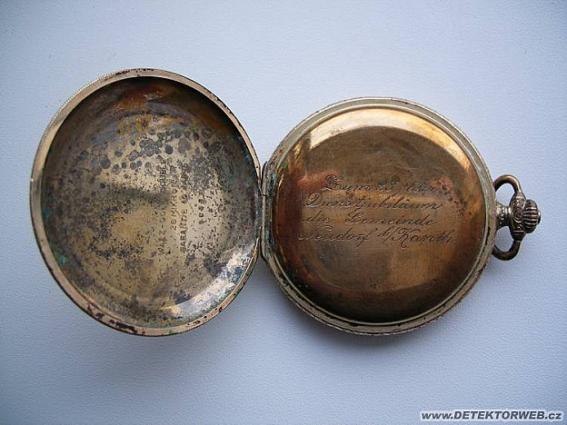 13. 06. 2007, 14:08Na protiprachovém víčku hodinek je napsáno věnování "Zum 25 jahr. Dienstjubiläum die Gemeinde Neudorf bei Kanth", volně přeloženo "K 25. výročí služby (věnuje) obec Neudorf bei Kanth". Jednalo se obec ve Slezsku spadající pod vládní okres Breslau (dnes Wrocław v Polsku). V roce 1933 měla obec 395 obyvatel. Kanth se dnes jmenuje Kąty Wrocławskie. Pokud bych mohl poprosit o obrázek strojku hodinek na mail.