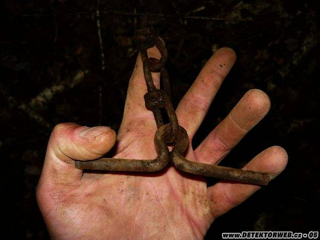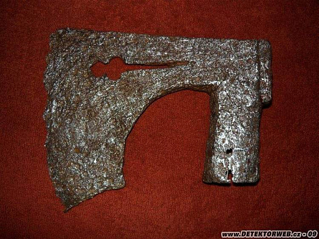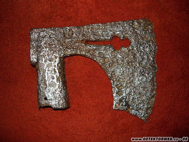 V hloubce cca 5 cm ležela totálně rezavá sekera pokrytá opravdu mohutnými nánosi rzi a hned vedle ní byl stočený řetěz v daleko lepším stavu. Je možné, že oba předměty už někdo přede mnou vykopal, ale protože nebyly ze zlata, tak je tam nechal. Řetěz je asi mladší než sekera. Na posledních pěti fotkách je sekera po základní očistě. Kousek od místa nálezu téhle sekery jsem letos vykopal granát a třmen. Vyplatí se chodit i na místa, o kterých si člověk myslí, že je důkladně prohledal, protože tam přece jen něco mohlo ještě zůstat.