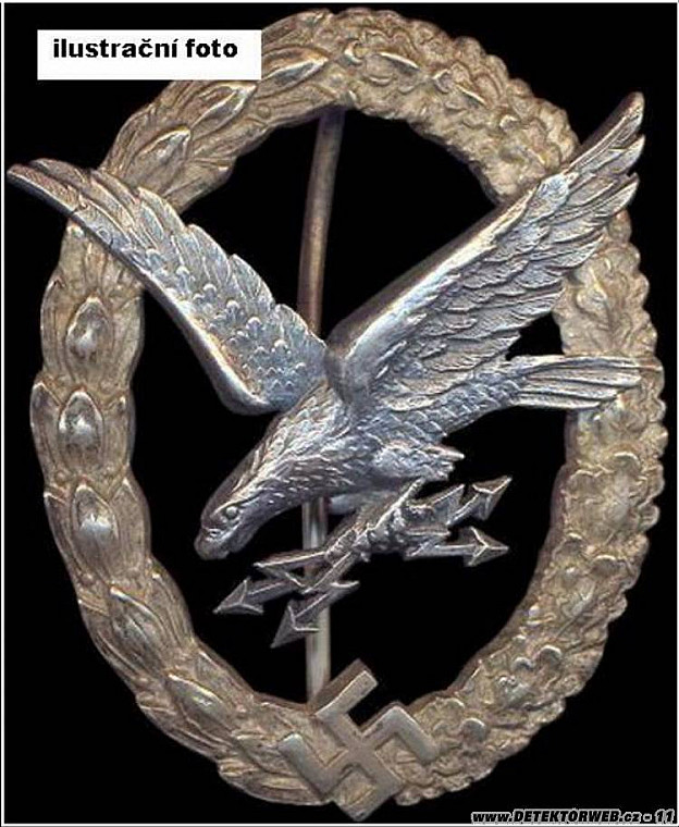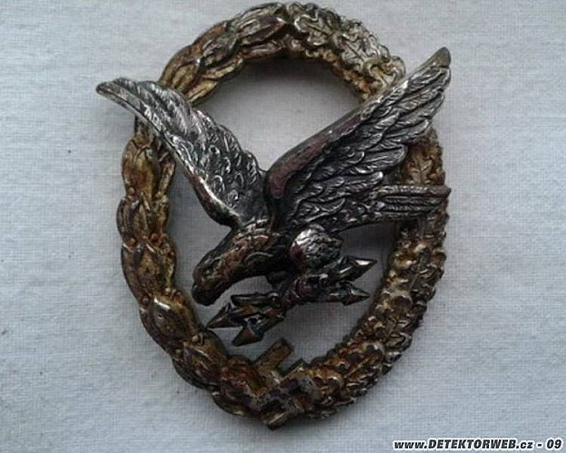 Tak tohle byla opravdu VELIKÁ radost: Fliegerschützenabzeichen für Bordshützen und Bordfunker (letecký odznak pro palubní střelce a palubní radisty) nebo taky zkráceně Bordfunkerabzeichen od firmy "B&N L" (Berg & Nolte Lüdenscheid). Odznak byl zaveden říšským ministrem a velitelem Luftwaffe Hermannem Göringem dne 19.1.1935. Byl určen pro letové posádky (radista, střelec a palubní inženýr) a uděloval se nejdříve až po roce činné služby od základního výcviku. Během války byla tato praxe změněna a odznak mohl získat člen letové posádky už po dvou měsících aktivní služby nebo za pět bojových misí či za zranění při bojovém letu. Od 12.12.1941 je pro odlišení zaveden pro palubní mechaniky a střelce stejný odznak, ale bez blesků (Fliegerschützenabzeichen ohne Blitzbündel für Fliegerschützen und Bordmechaniker). Orel s blesky zůstal jen pro Bordfunkery – palubní radisty. Když vykoukl z hlíny, tak to bylo na cigáro, jak se mi třásly ruce. Očista proběhla jenom v destilce a suchým flanelovým hadříkem.