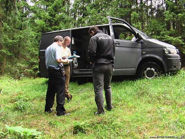 Jsou tam vidět i malorážkové náboje a olověné střely. V jednom místě se narazilo na větší množství munice pohromadě. Na jiném místě byly náboje jen lehce pod jehličím. Některé náboje vypadaly po vyndání ze země pěkně. Ty by ještě nějaké desetiletí v zemi vydržely, než by je sežral také rez. Na některých nábojích už rez silně řádila. Našli jsme i náboje do pistole. Na některých napáskovaných nábojích bylo vidět, že byly ještě v krabičkách. Vedle nádherného hříbku byl ukrytý americký dýmový granát. Nechat tam takového krasavce by byl hřích. Po nálezu granátů jsme zavolali policii, která okamžitě přijela a zavolala pyrotechniky. Neotevřená „hnízda“ s municí si pyrotechnici otevřeli sami. V tomto „hnízdě“ bylo asi 45 rozbušek a patnáct třecích zapalovačů. Pyrotechnici si naplnili přepravku a odnesli ji do svého auta.