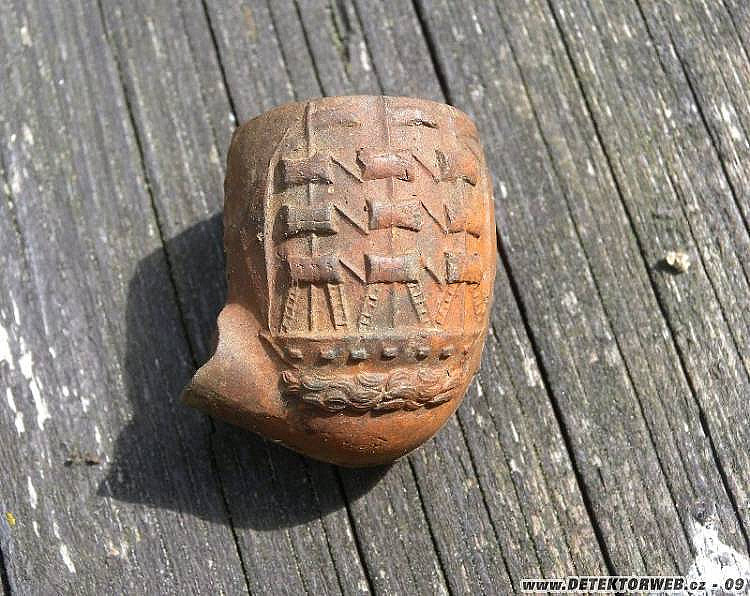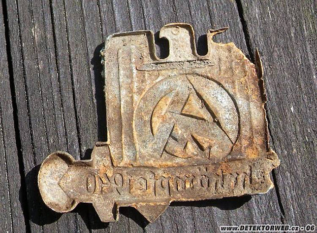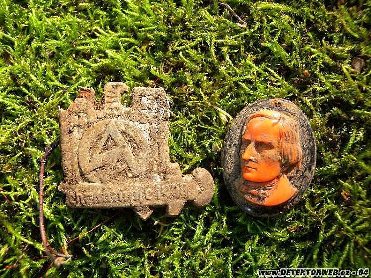 Potěšily i drobnosti - torzo dýmky s lodí a kotvou, střípek s vojáky, kalamáře, lahvička od karlovarské vřídelní soli, módní spona (19.stol.?), odznak SA Wehrkampfe 1940, winterhilfka tentokrát skutečného velikána, vynálezce lodního šroubu J. Ressla...
