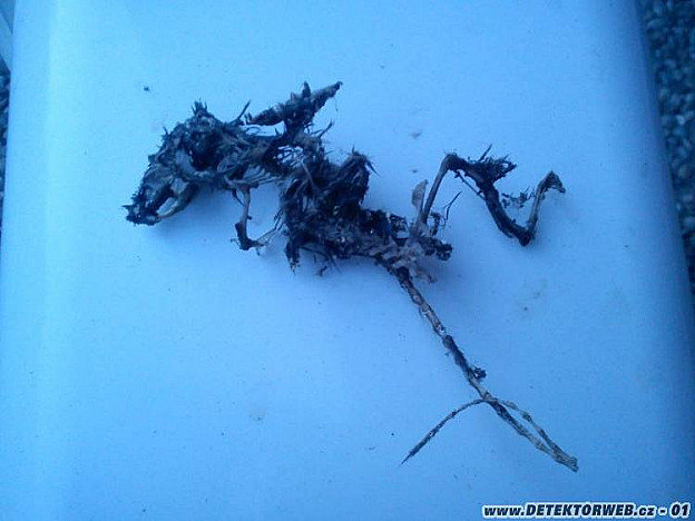 Pak je tam foto nálezu z lesa, terka hlásí slabě 12 a říkám si okraj lesa, již zde ag vypadlo, bude snad přírůstek, čtyřikrát do hloubky rýpnu a vyvalím čtverec drnu až do hloubky spodní staré žluté vrstvy, přejedu v očekávání vyrvaný kus matičky země a nic, přejedu obstojný kráter a signál se hlásí uprostřed jamky, říkám si, tahle hloubka a ohlas, moje očekávání se již téměř rovná jistotě, mohutně zaryji draperku do dna a podzolová půda se válí i s detekovaným předmětem vedle jamky, teď již jen ten poklad vyprostit na světlo boží.