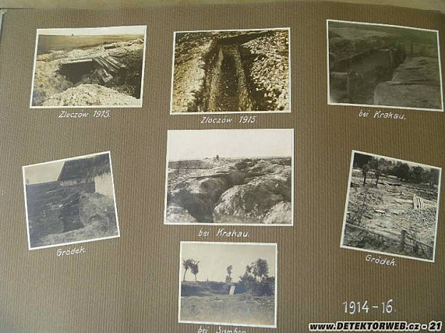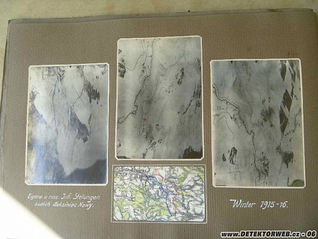 Pri prilezitosti jeho odchodu od letectva do novej funkcie inspektora zeleznicnej dopravy mu jeho kolegovia rucne vyrobili fotoalbum ako pamiatku na Velku vojnu. A tento album sa nachadza v mojom vlastnictve. Zasielam malu cast fotografii z tohto albumu. Su tam okrem ineho nespocetne fotografie frontovych oblasti urobene z lietadla na ruskom a ciastocne aj talianskom fronte v rokoch 1914-1916. Casto krat su na fotografiach zaznacene farebne frontove pozicie a su dolozene farebnymi mapami. Dalej su tam fotografie z letiska, vlastnych lietadiel, ukoristenych nepriatelskych lietadiel atd. A to vsetko je opatrene popiskami a umeleckymi kresbami.