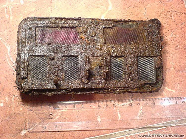 Tak zase posílám něco šrůtku na určení. Jedná se mi o ten zrezlý cajk velikosti školního penálu. Na jedné straně jsou sklíčka červená a na druhé zelená, podle potřeby se daly překrývat krycím plechem na pantu. Bylo to k něčemu přišroubovaný, takže nejspíš nějaká signalizační lampa, kterou se vyznačovaly třeba noční přesuny, nebo řídil noční provoz na ústupovce. Tolik má teorie, pokud někdo ví víc budu vděčen.
