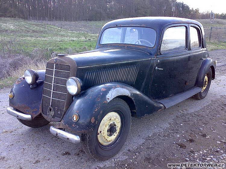 Po delší době jsem si udělal radost, o kterou se chci podělit i s Váma. Vzhledem k tomu, že,, dělám´´ Německo a na KDF nebo jiný německý vojenský veterán, díky svým příjmům (asi jako převážná většina z nás), nebudu v životě mít, tak jsem neváhal a vzal zavděk tímto,, medvědem´´... Cena byla ehm, dá se říct celkem výhodná, přihlédneme-li tedy k tomu, že auto vzhledem ke svému stavu a věku, vyjelo vlastní silou na odtahovku, má bílé SPZ(teď už psané na mne) a já se upsal spořitelně na další tři roky... Auto jsem zakoupil v Písku a cesta zpět do Mostu, byla pro mne nekonečným utrpením,. To proto, že jsem předchozí večer, na oslavu mého nového vozu, degustoval s kamarádem, jeho výtečnou pálenou slivku... Dle původního majitele, stál vůz zhruba od roku 1975 kdesi ve stodole na špalkách. Asi v 90 letech, jej zakoupil a chtěl jej renovovat. Takže pak opět odpočíval na špalkách až do dnešních dnů. Boužel, nedostatkem času a jiných aktivit, jako je přestavba domu následná potřeba peněz, se jej rozhodl prodat. Můj původní záměr po koupi byl, dát jej po renovaci do polní šedi, aby se sním dalo jezdit na akce KVH (viz. foto-VTM Lešany). Ale téď jsem na vážkách, černá je taky hezká... A teď k vozu. Jedná se o Mercedes 170 V z roku 1937.Je to jeden z nejrozšířenějších osobních automobilů používaný všemi jednotkami německé branné moci, druhé světové války. Palubovka nepůvodní (bývalý majitel mi dal tu správnou, ale boužel bez přístojů), zadní světla asi z Moskviče a jiné další socialistické ůpravy v duchu doby... Tzv. stav odpovídjící stáří vozu...