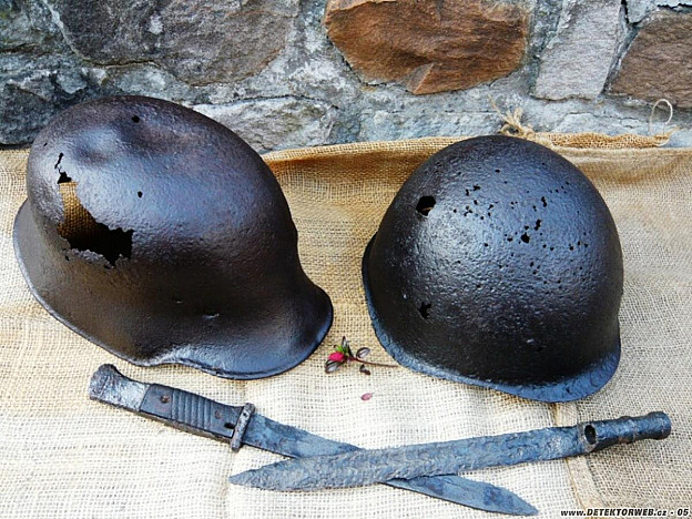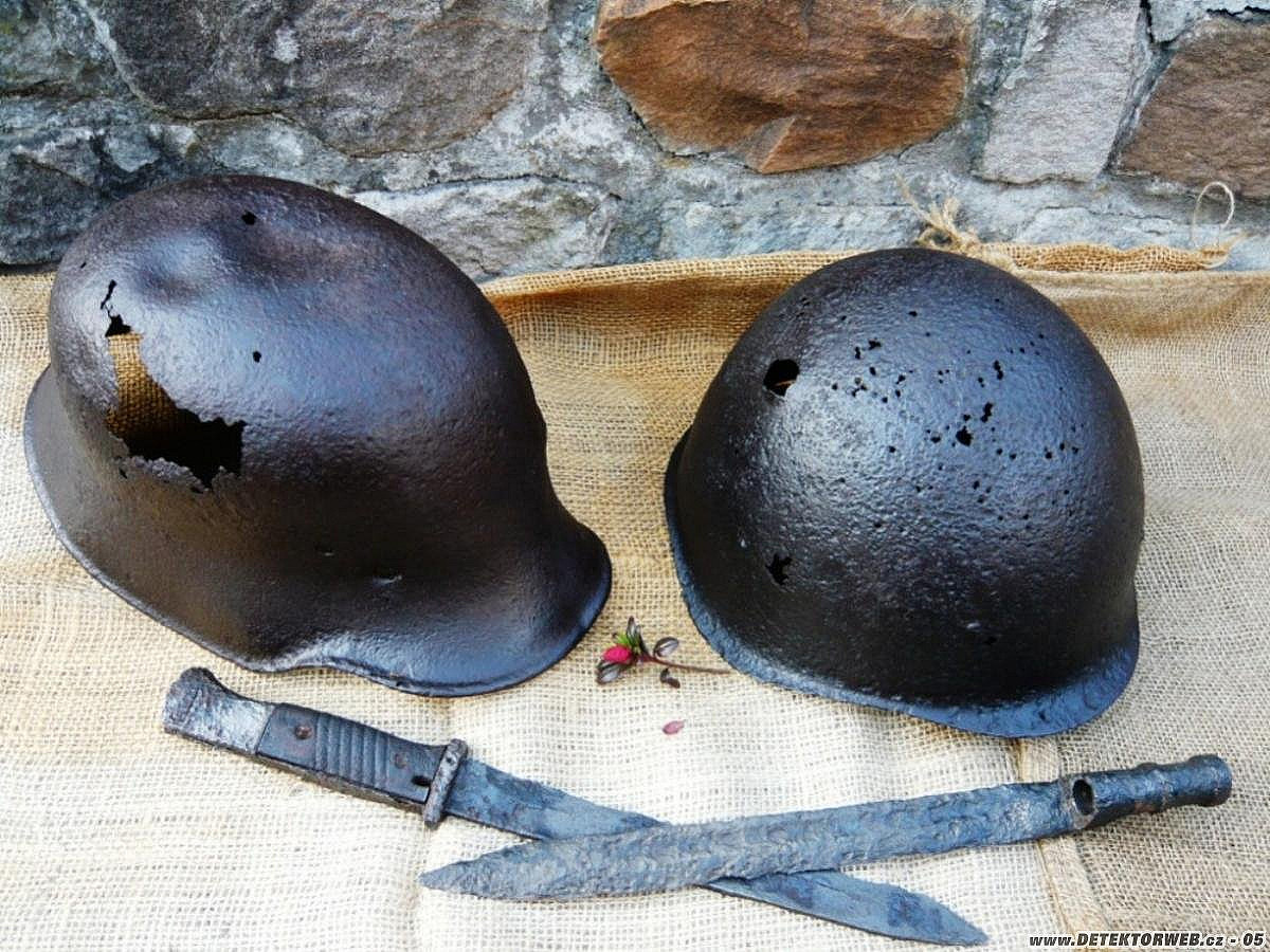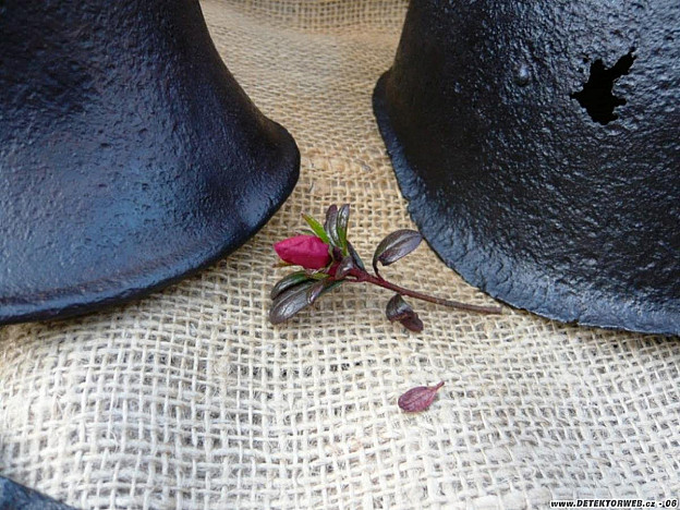 Zdravím.Jak se tak dívám, kde nic tu nic. 9.květen se asi nejspíše vymaže z kalendáře. Krátkou to paměť máme. Tak jsem alespoň hrábl na půdu a oprášil tyto artefakty připomínající tuto dobu. Pravděpodobný děj: 1) německá přilba prostřelena zvenčí, ale střela neprošla skrz. Kde asi skončila? 2) ruskou přilbou prošla už zdeformovaná střela. O co se deformovala? Nechám na vaší fantazii. Končím vzpomínkou na píseň skupiny SYNKOPY: Válka je vůl.