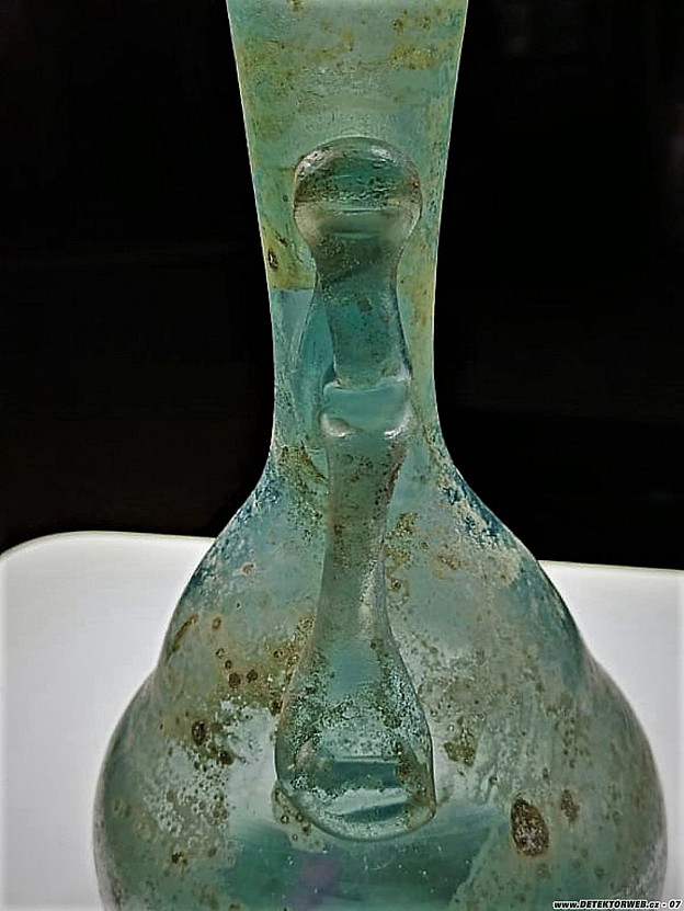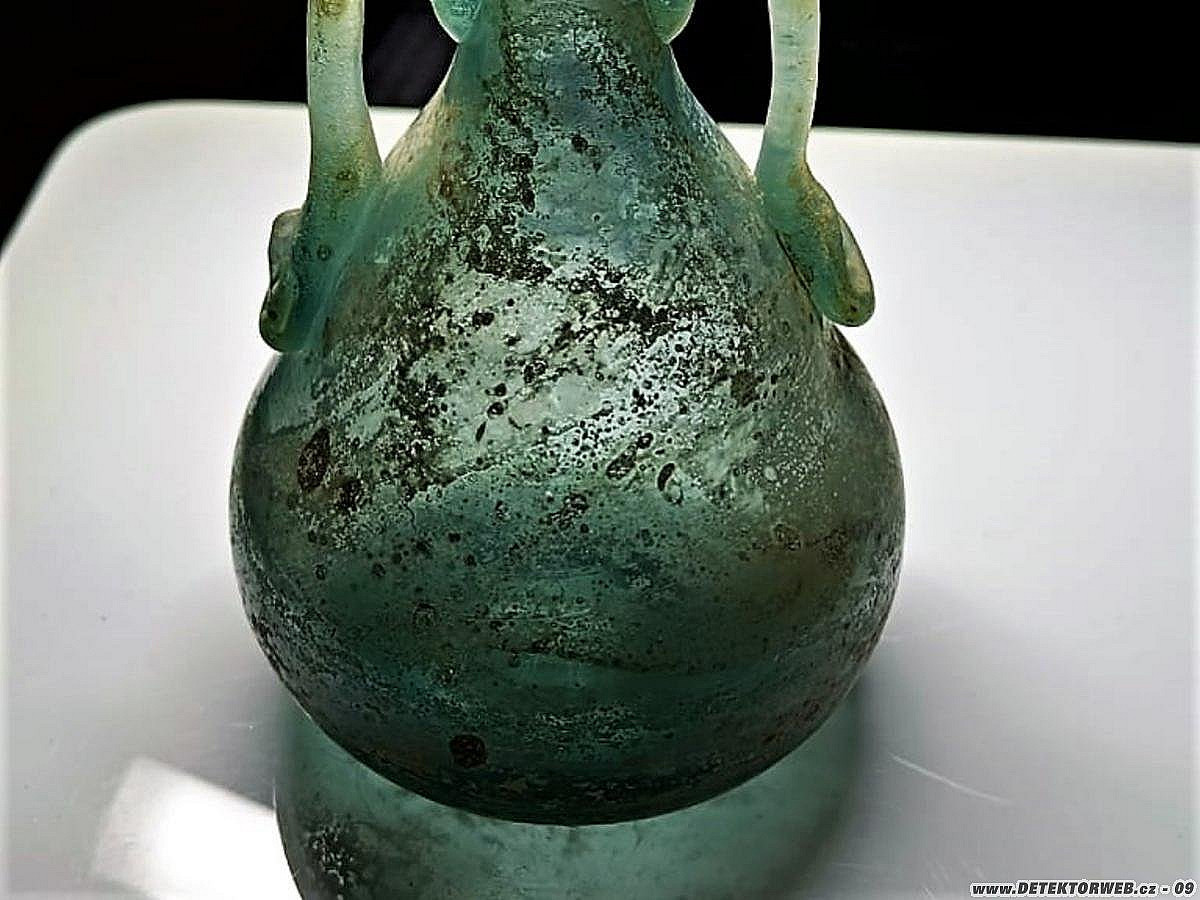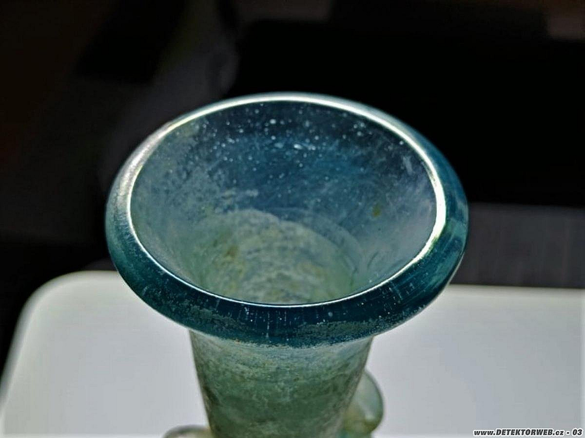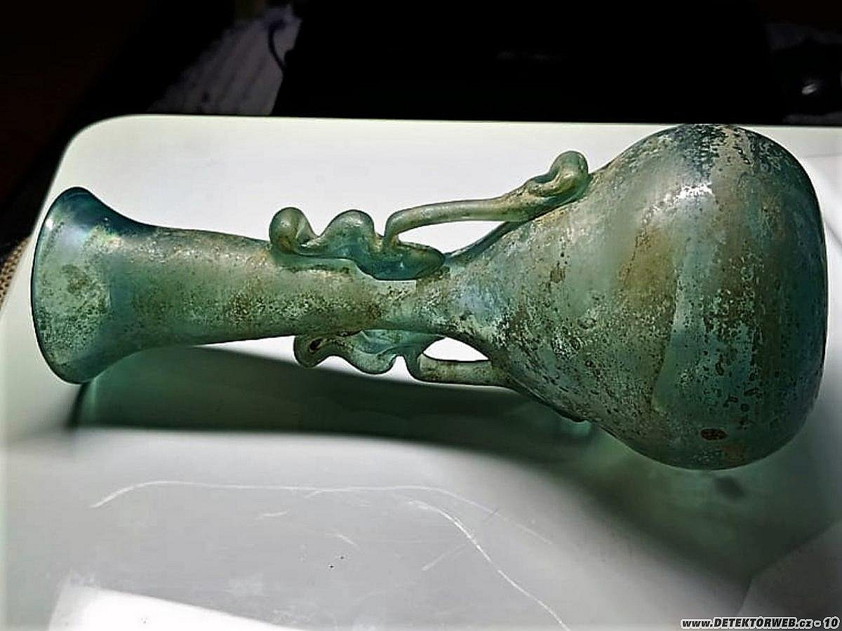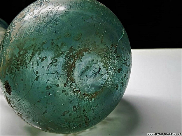 01. 04. 2022, 13:18No bylo to vyrobené tzv přepíchnutím. Tedy že se na píšťale vyfoukne baňka, pak se přilepí tyč na dno a vytvaruje se hrdlo. V antice se duté sklo vyrábělo vinutim skloviny na jádro. Píšťalu a foukané sklo vynalezli Fényčané. Na dně je stopa po odlomení tyče. Takže za mně mladší replika. Lazurace povrchu se dělá sodou a kovovým prachem. A Lesní sklo je pojem pro středověkou produkci kdy do skloviny přidávali bukový popel který barvil sklovinu do odstínů od šedozelené po temně zelenou. Lesní pak pro to, že středověké sklárny se budovaly v lesích, právě pro dostupnost dřeva.