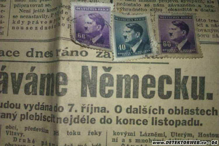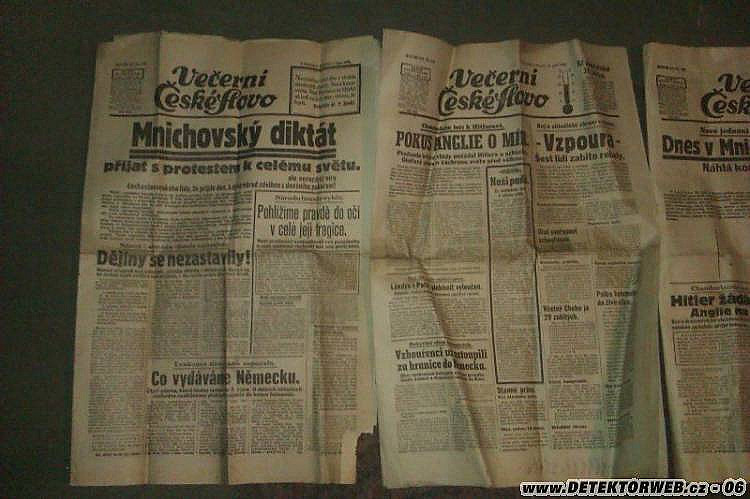 zasílám fotografie novin, které jsem nalezl na půdě hned vedle více než 100"vky" dopisů, na kterých byla známka s Adolfem. Podle internetu je cena okolo 6000 korun. Jedná se o 4 výtisky válečných novin "České Večerní Slovo". Datované na rok 1938 (3 x) a 1942 (1 x). Ve dvou výtiscích se dokonce píše o Mnichovské dohodě.