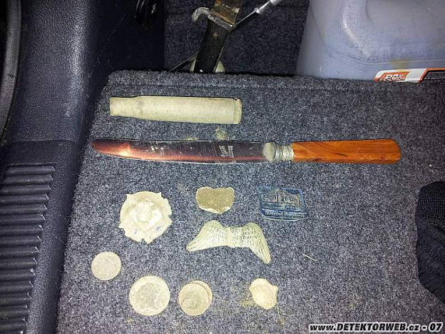 Zase naše oblíbená hra pole vs. kapsa, opět na plné čáře vyhrálo pole asi 38 ku 12 :D Začalo to tim, že jsme šli prohledat starý vyschlý rybník, ale poté co jsem vytáhl hned na začátku ve 30 cm hloubce buchnu, mě přešlo jakékoliv bahnění. Dál jsme šli na hranice ČR a DE a tam jsme našli chebský odznáček pro LW, pak nějakou nábojnici, tu bych prosil určit :) Prošli jsme nějaká pole, jeden minismeťáček, který nabídl Winterhilfku. Dobrá story je s tim příborákem, který byl zapíchnutej uprostřed kukuřičného pole a hned vedle něj se nacházel ten PS odznáček. Do auta jsem dotáhl víc bahna než věcí, tak pak mě čekala očista :))) Nachodili jsme kilometry ale bez většího úspěchu, snad se příští hledání vydaří víc. Přeji hodně úspěchů!