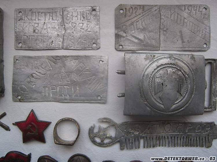 Super kus je ručně vyrobený prsten – snad z nerezu v místech, kde se udržovala technika. Zadařilo se mi nalézt i rozlišovací znaky druhů vojsk, které zde tábořily a to kavalérii, dělostřelectvo a intendantní službu (ubytovatel, zásobovač), gardový odznak, dvě kolodky (bohužel bez medajle) a stužkovnici.