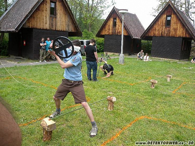 O sobotním dopoledni byly na programu především soutěže. Na protivanovském setkání hledačů pokladů s Detektorwebem před třemi lety se s velkým zájmem setkala nová soutěžní disciplína nazvaná „Dálkově řízený archeologický průzkum“ a ve Sloupu měla úspěšnou premiéru loni, a tak jsem ji zopakovali i letos. Připomínáme, že úkolem „archeologa“ sedícího na své židli v teplíčku "kanceláře", který dostával do bezdrátových sluchátek signál z cívky Deuse v rukou hledače, bylo pomocí provázků a povelů řídit hledače, který měl zakryté oči, tak aby ve vymezené dráze nalezl tři volně ložené cíle v trávě. Původně to byly mosazné matice, pro tento ročník nám Martin vyrobil měděné mince s emblémem Detektorwebu a našeho sdružení Archeus DW. Zvítězila dvojice, která v nejkratším čase našla tři mince a prošla celý 10 metrů dlouhý polygon v nejkratším čase. S nadsázkou si soutěžící mohli vyzkoušet, že ne vždy to s námi hledači má archeolog jednoduché. A i obráceně, že hledači některým archeologům nerozumí. Nakonec se ale ukázalo to hlavní, že spolupráce je přínosem pro obě strany. Opět se skvěle bavili soutěžící i diváci, tím spíš, že letos byla disciplína „zostřena“ překážkou, kterou musel na trati „slepý“ hledač naváděn „archeologem“ překonat.